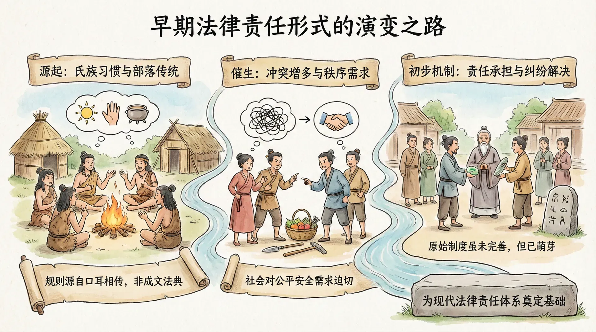 随着人与人、群体与群体之间的冲突增多,社会对公平、秩序和安全的需求日益迫切,于是逐渐催生出初步的责任承担与纠纷解决机制。这些原始形态的制度虽未臻完善,却为后来系统的法律责任体系奠定了基础。