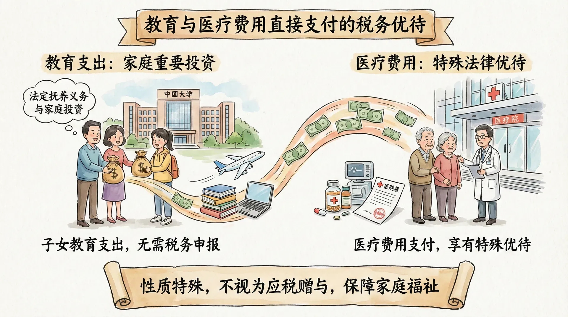为子女或其他家庭成员支付教育费用和医疗费用,是一种特殊的财产转移方式。这种支付在性质上属于赠与,但由于其用途的特殊性,在法律和税务上享有优待,通常不被视为应税赠与。