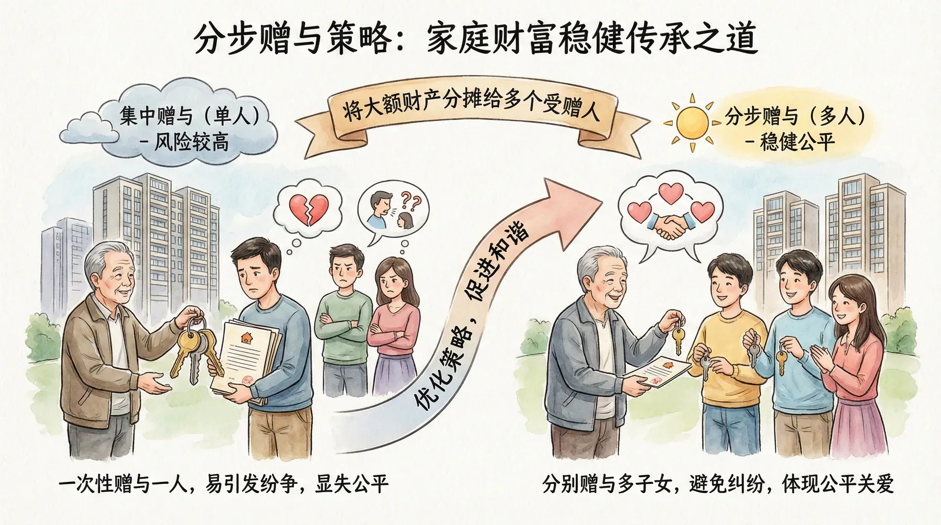 在家庭财富传承中,将大额财产分摊给多个受赠人,比一次性赠与给单个受赠人更为稳健。王老先生有两儿一女,打算将自己的三套房产传给子女。他可以选择生前分别赠与给三个子女各一套,也可以先全部赠与给长子,由长子再分配给弟妹。前者更为合理,既能避免子女间日后产生纷争,也能让每个子女直接从父亲手中获得财产,体现父爱的公平性。