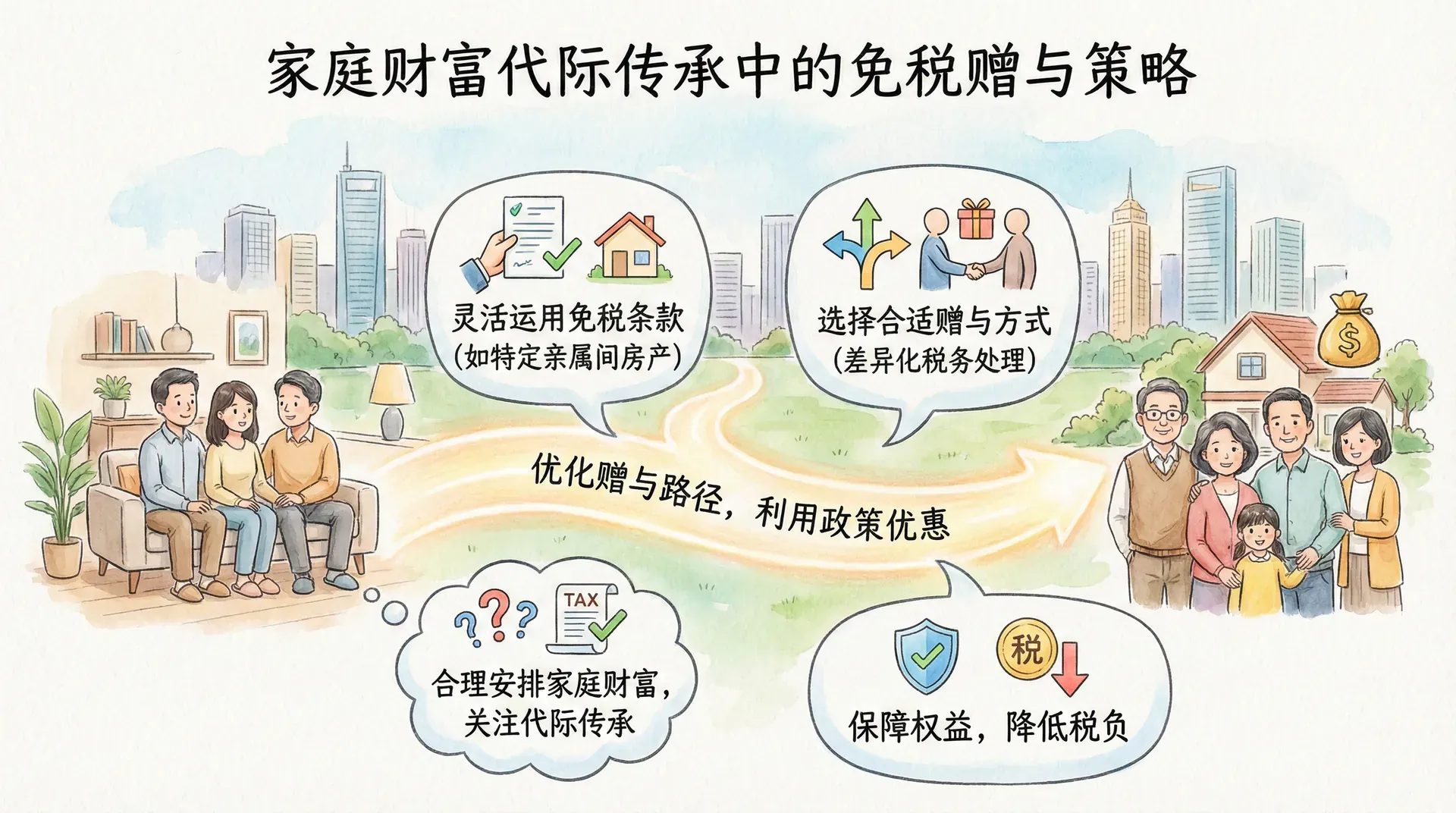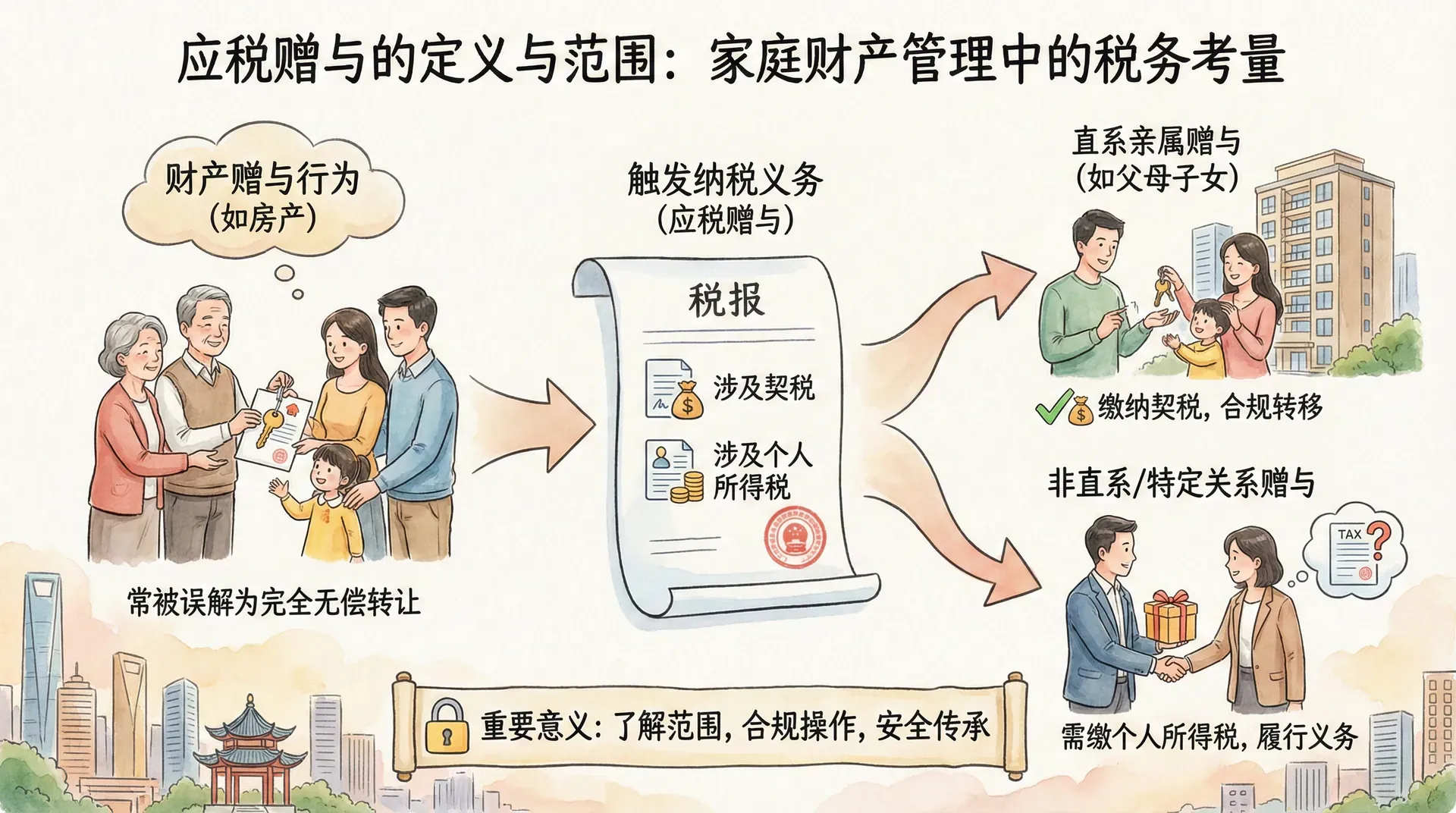 在家庭财产传承和财富安排过程中,赠与是一种常见且重要的财产转移方式。合理利用赠与,不仅能提前将部分财富传递给下一代,还能实现税务优化、满足家庭成员的不同需求。然而,赠与行为在我国税制下涉及契税、个人所得税等多项税费政策,法律处理细节较为复杂。