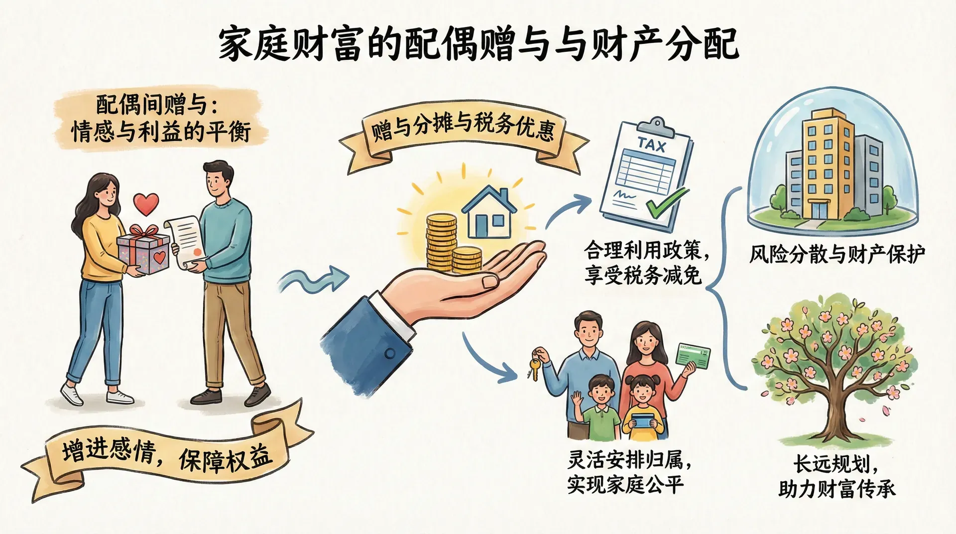 在家庭财产管理和财富传承过程中,配偶间赠与和赠与分摊是非常重要而常见的安排。配偶之间的财产流转不仅关系到夫妻双方的利益平衡和财产保护,同时也有诸多税务优惠政策可以合理利用。通过赠与分摊,家庭成员能够根据实际需要,灵活地安排不同财产的归属,既保障了公平,也有助于风险分散和税务优化。