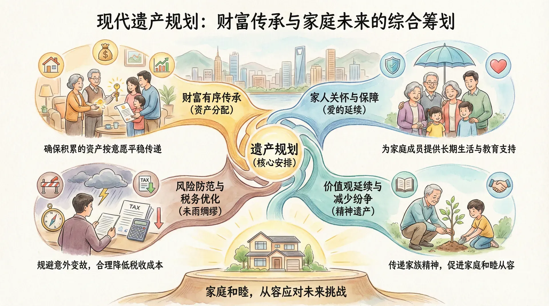 遗产规划的内容:遗产规划不仅仅是写一份遗嘱那么简单,它是一个系统性的财产管理和传承计划,涵盖了遗嘱、信托、保险、财产所有权安排、税务筹划、行为能力丧失应对等多个方面。遗产规划与财富管理相辅相成,共同构成完整的财务规划体系。