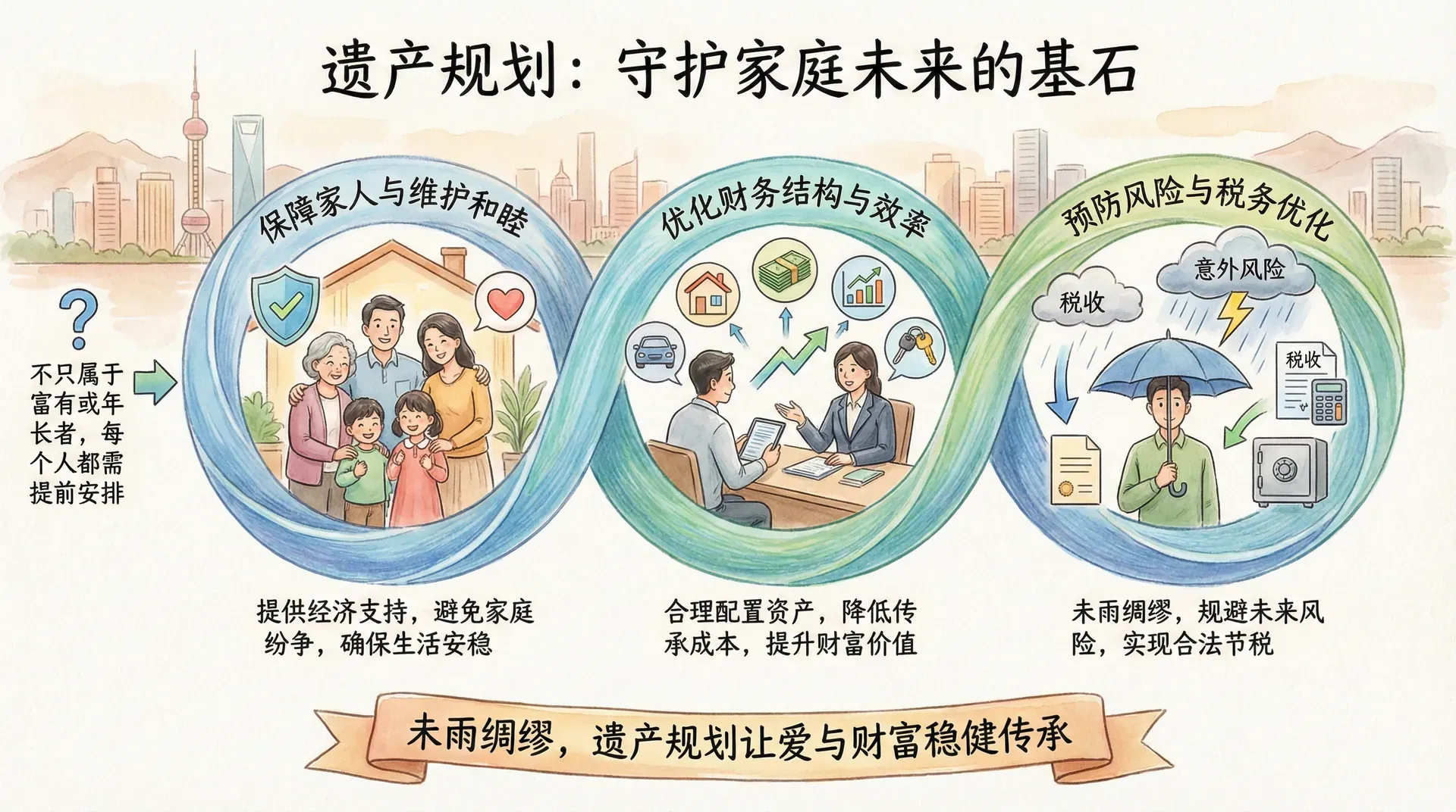 遗产规划不仅仅是一份法律文件,它是一种保障家人、维护家庭和睦、优化财务结构的重要方式。许多人认为遗产规划只属于高净值人群或老年人,事实上,无论家庭财富多寡,每个人都需要提前安排自己的财富传承。随着社会结构的变化、家庭关系的多样化以及财产种类的日益复杂,未雨绸缪地进行遗产规划,能够有效预防经济风险,提升财富传承的效率和安全性。接下来,让我们具体探讨遗产规划在守护家庭、避免纠纷和税务优化等方面的重要意义。