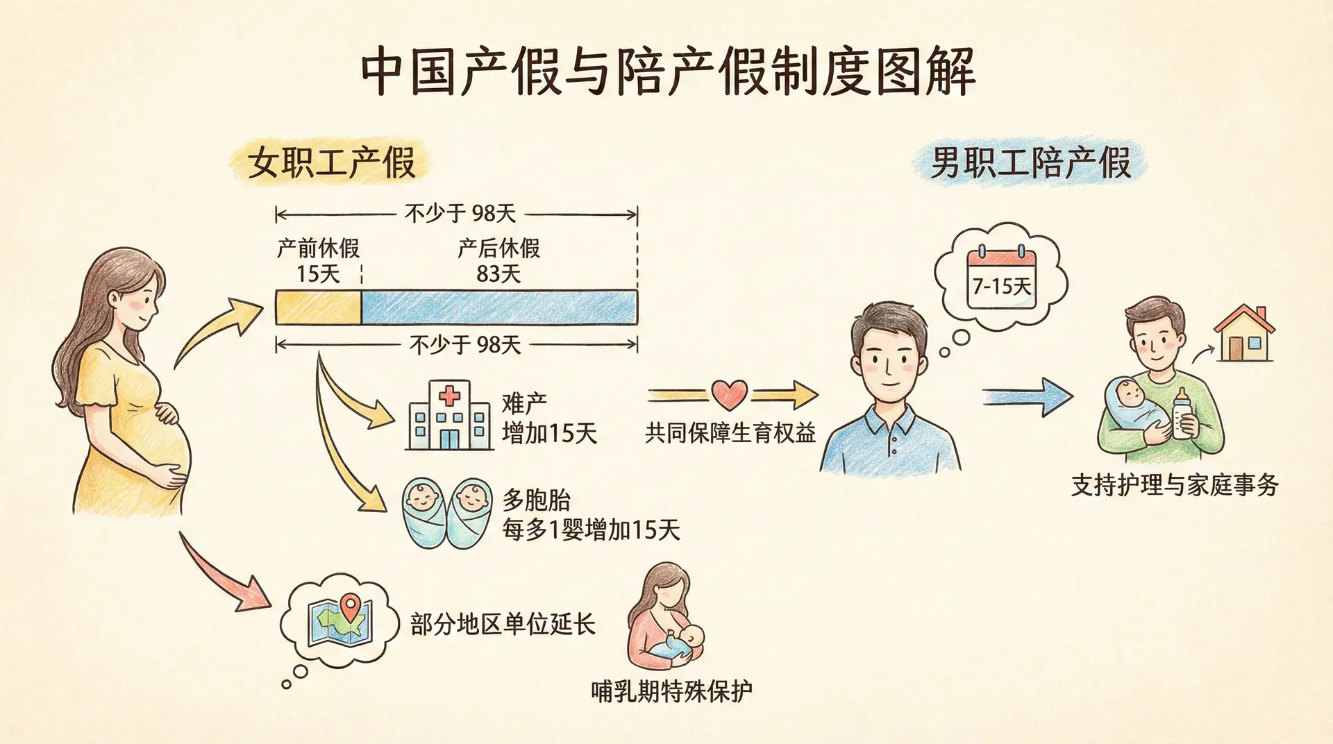 各地在国家规定的基础上,根据地区实际拓展了产假和陪产假的天数,增设了育儿假和老人护理假等新型假期制度。通过这些制度设计,国家既保障了劳动者的基本权益,也力求促进性别平等、家庭和睦与社会和谐稳定,同时减轻家庭在生育和抚养子女过程中的压力,助力人口政策的有效落地与社会可持续发展。