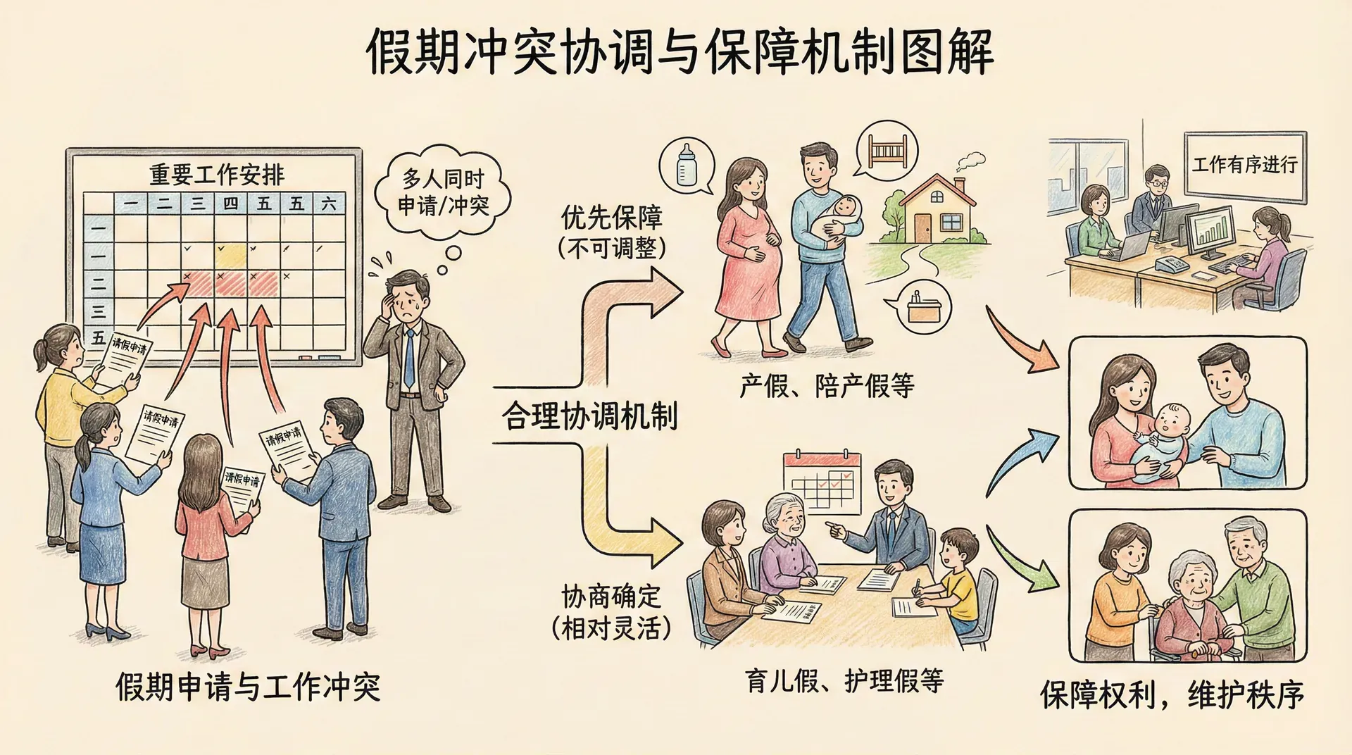 在实际工作中,可能出现多名职工同时申请假期或假期与重要工作安排冲突的情况。用人单位应当建立合理的协调机制,既保障职工的假期权利,又维护正常的工作秩序。