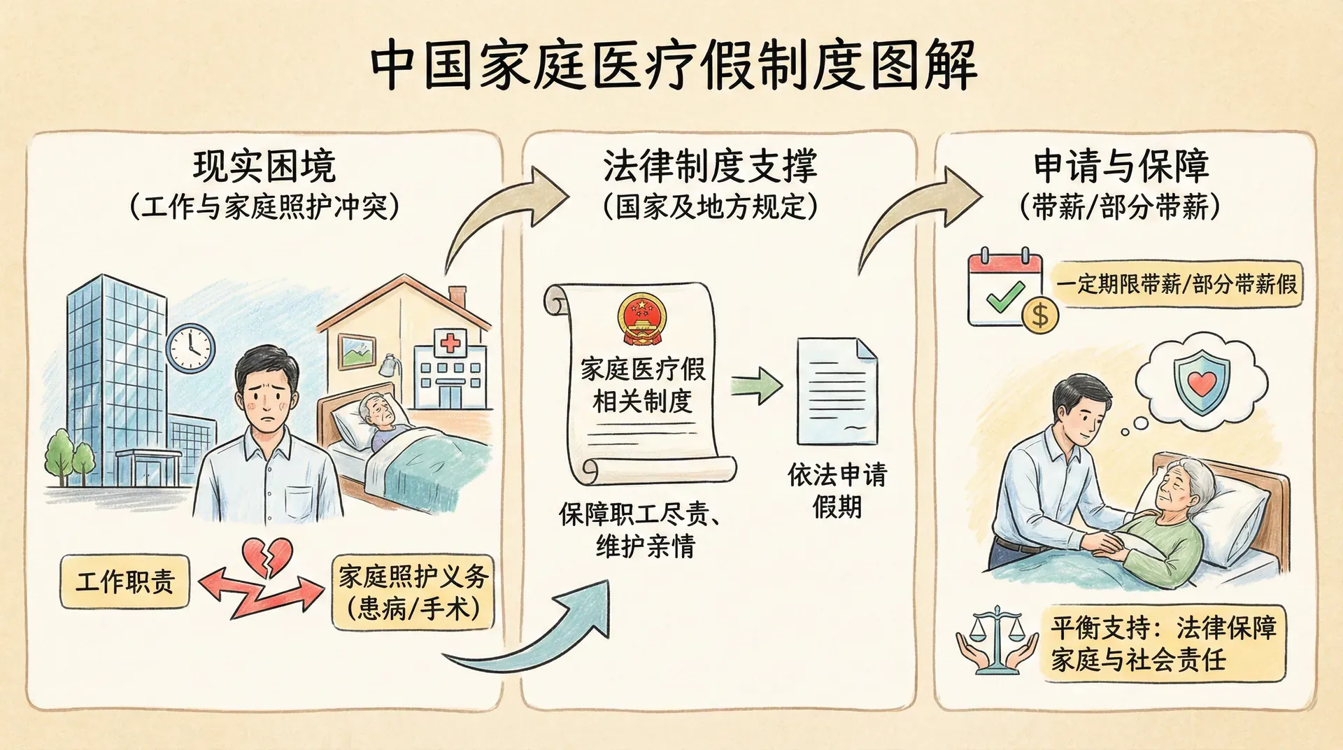 当家庭成员(如父母、配偶、子女等)因患病、手术、住院等原因需要他人照料时,职工往往需要在工作职责与家庭照护义务之间做出艰难的取舍。面对这种现实困境,为了保障职工能够尽到家庭成员照护义务、维护亲情关系,同时不因履行家庭责任而受到工作上的不利影响,国家及部分地方出台了家庭医疗假相关制度。