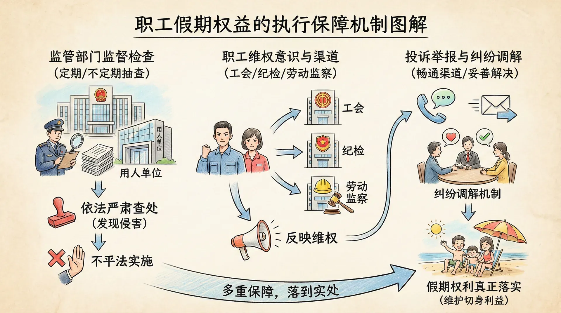 假期权利的实现不仅依赖于法律的明确规定,更需要配套的执行保障机制。首先,相关监管部门应当建立完善的监督检查制度,对用人单位落实假期政策的情况进行定期或不定期的抽查,一旦发现侵害职工休假权的行为,应依法严肃查处。