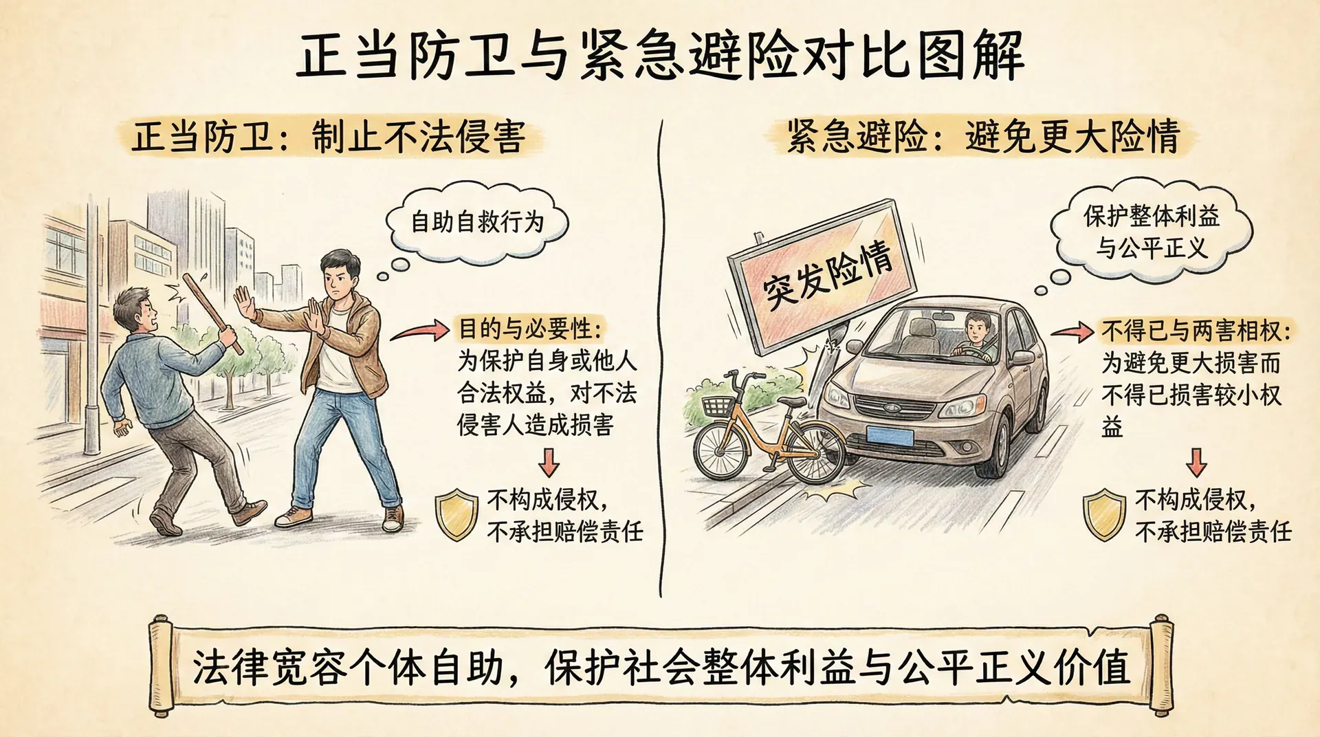 正当防卫是一项古老而重要的法律制度,它允许公民在遭受不法侵害时,采取必要的反击措施来保护自己或他人的合法权益。正当防卫虽然客观上造成了损害,但由于其正当性,不仅不构成侵权,反而是法律所鼓励的行为。这体现了“法律不向不法让步”的基本理念。