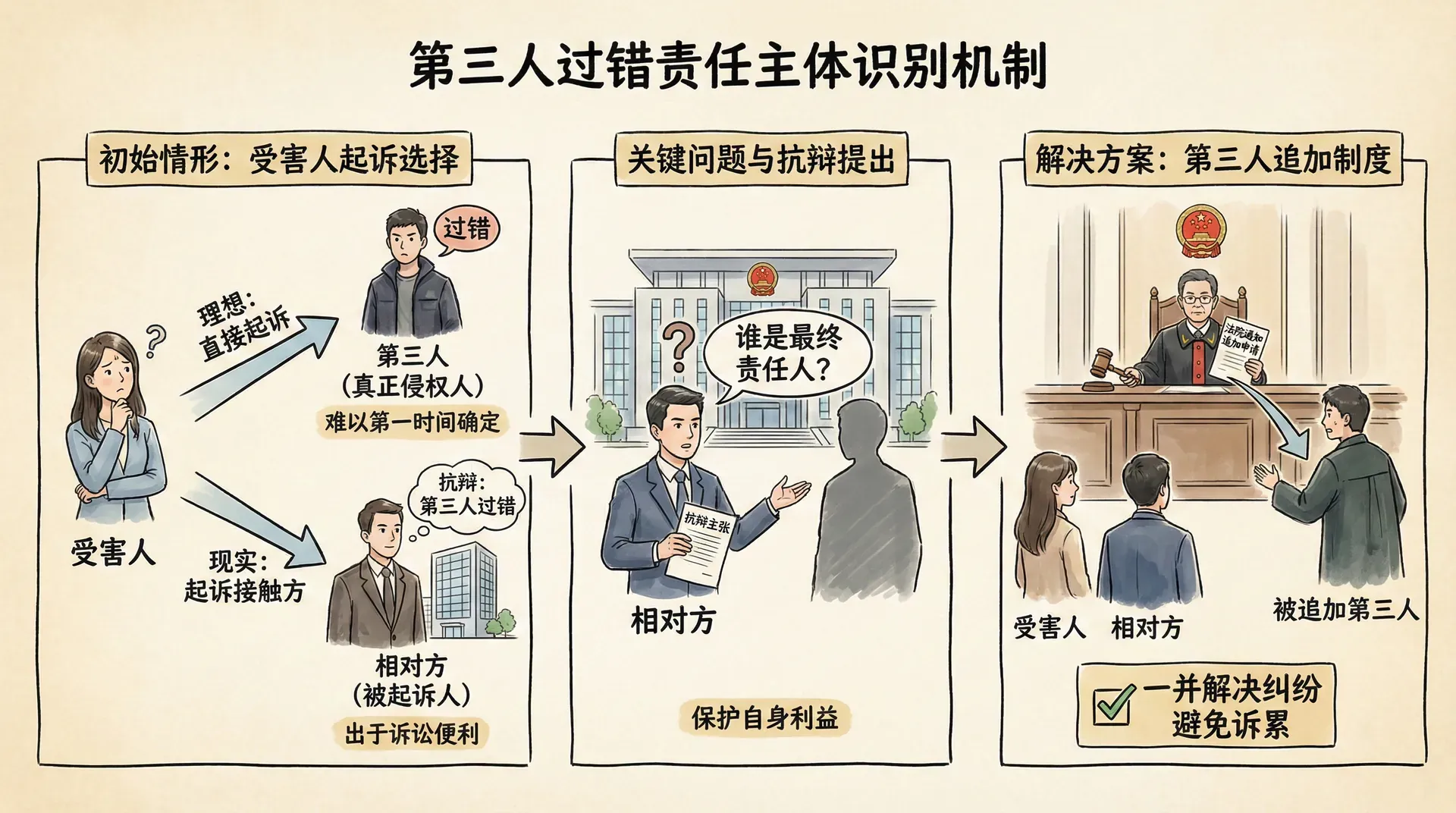 诉讼中的第三人追加制度为解决这一问题提供了程序保障。当被告主张存在第三人过错时,法院可以通知第三人参加诉讼,或者被告可以申请追加第三人为共同被告。通过将真正的责任人纳入诉讼,可以在一个诉讼中彻底解决纠纷,避免受害人的诉累。