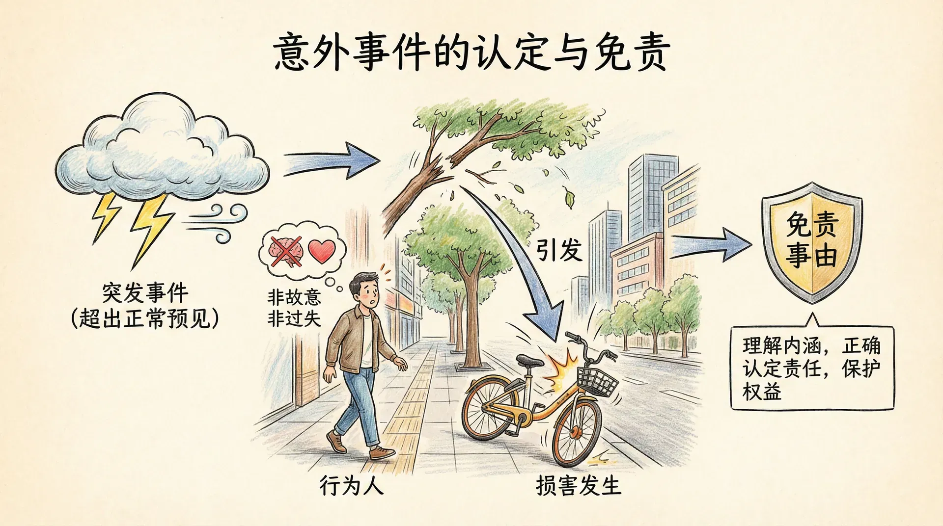 意外事件与不可抗力有相似之处,都是导致损害发生的客观原因,但两者又有重要区别。意外事件是指行为人的行为虽然在客观上造成了损害后果,但不是出于故意或过失,而是由于不能预见的原因引起的事件。意外事件的核心在于“意外性”和“不可预见性”。