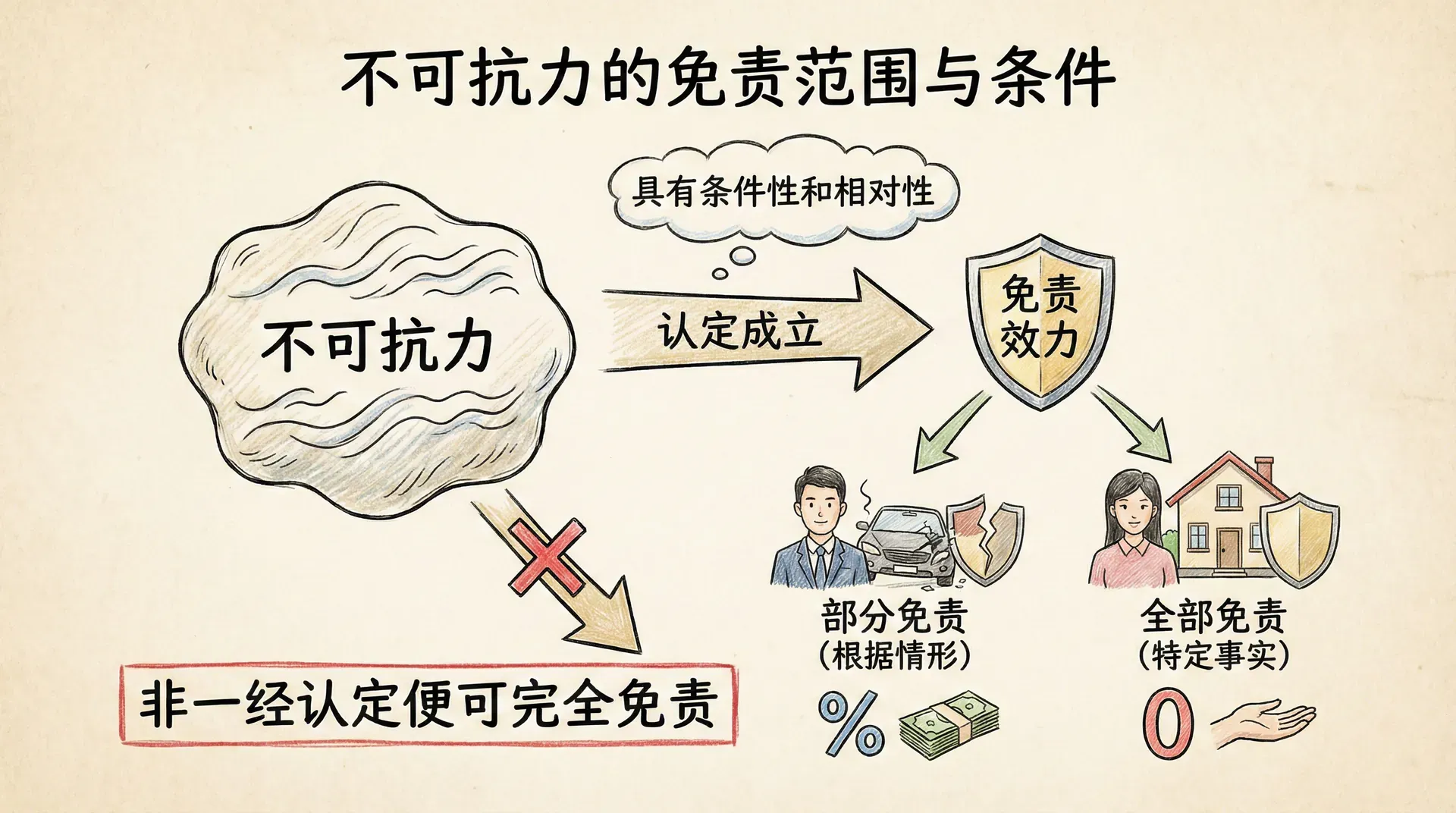 但在许多情况下,不可抗力只能部分免责。当不可抗力与当事人的过错共同导致损害时,应当根据各自的原因力大小来分配责任。不可抗力对应的那部分损害由受害人自担,过错对应的那部分损害由侵权人赔偿。这种部分免责体现了责任的相对性和公平原则。