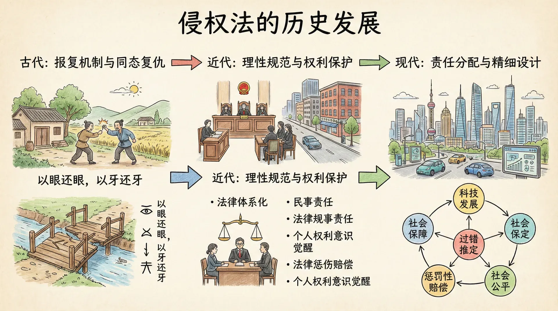 侵权法的历史发展是人类社会文明进步的重要体现,它反映了社会从原始的报复机制逐步走向理性、规范和体系化保护权利的进程。无论是古代法典中对同态复仇的朴素规定,还是现代社会对个人权益保护和责任分配的精细设计,侵权法都经历了漫长且曲折的演变。理解侵权法历史上的重大变革和各国制度的形成,对于把握当代侵权法的运行机制和未来发展趋势具有重要意义。