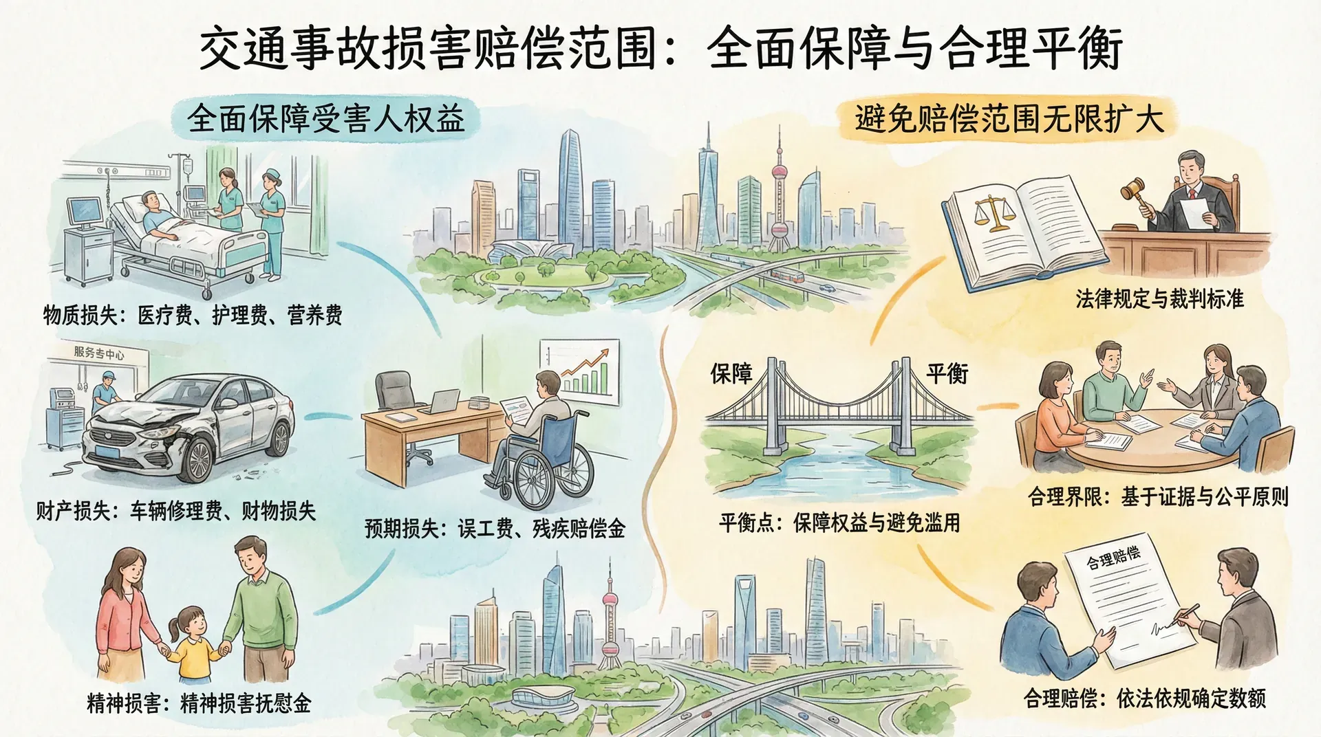 确定赔偿范围是交通事故损害赔偿的核心问题。受害人遭受的损失千差万别,既有物质损失,也有精神损害,既有现实损失,也有预期损失。法律需要在充分保障受害人权益和避免赔偿范围无限扩大之间寻找平衡。