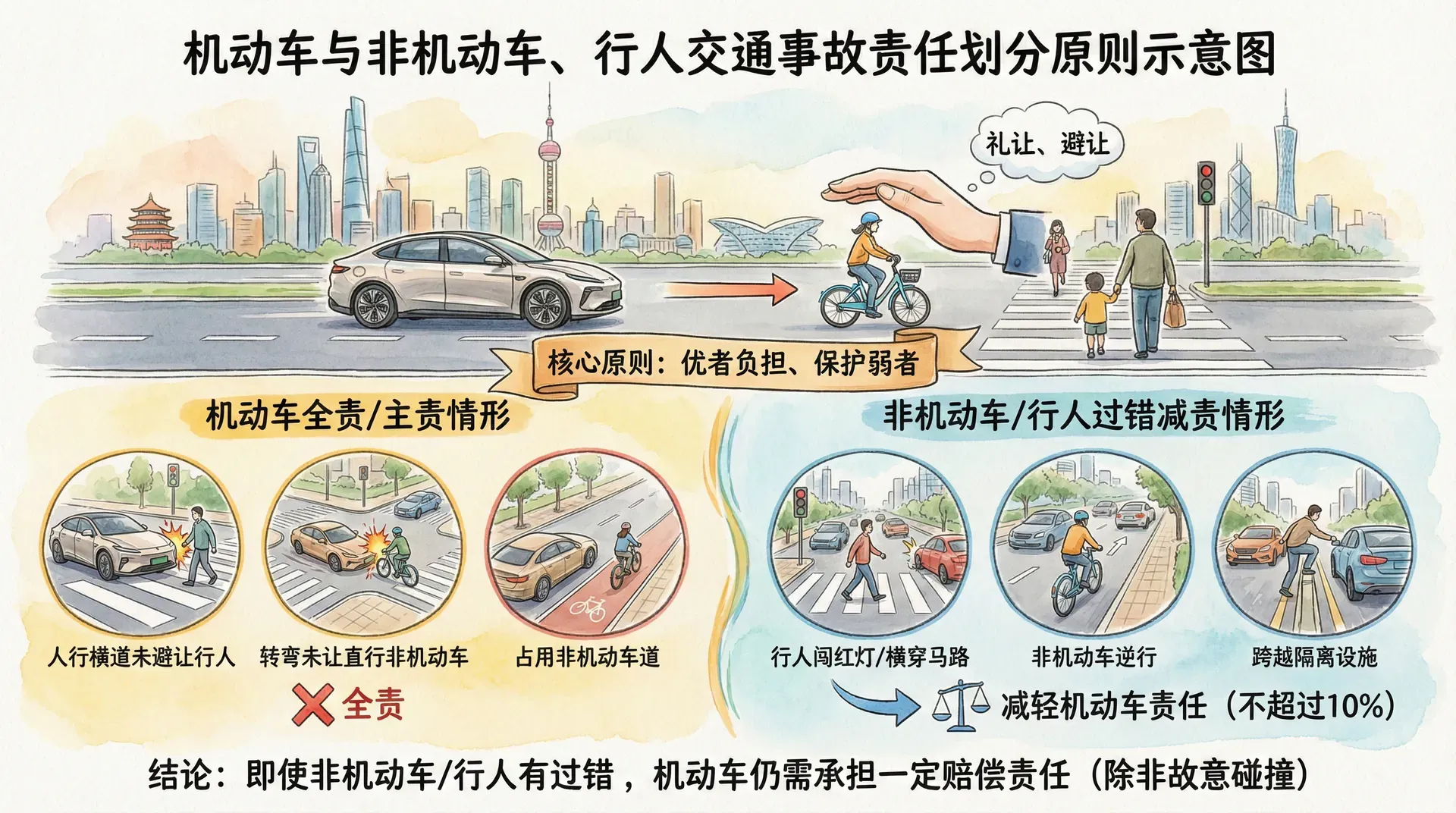 机动车与非机动车驾驶人、行人之间发生交通事故,赔偿责任的确定体现了对弱势群体的特殊保护。即使非机动车驾驶人、行人有过错,机动车一方仍要承担主要赔偿责任。