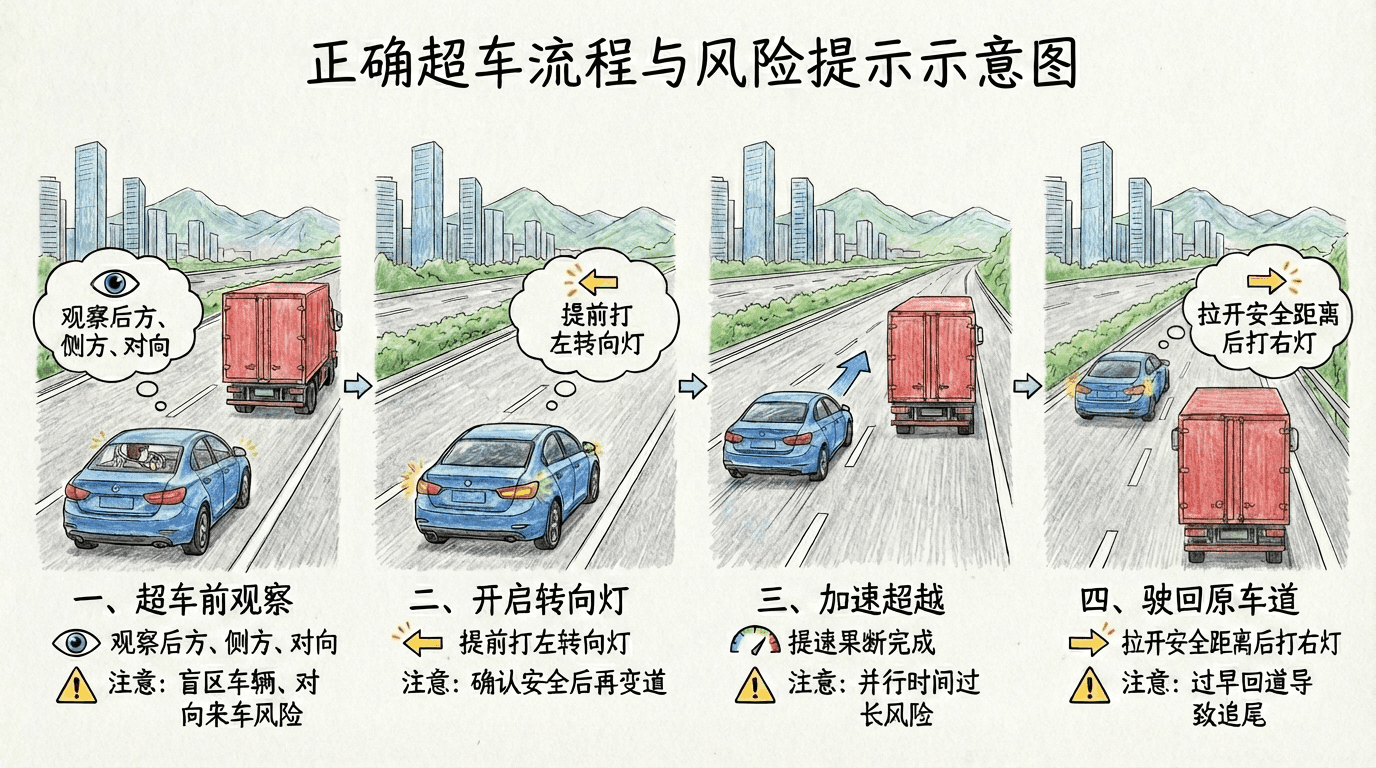 超车是道路行驶中的常见操作,但也是最容易引发事故的驾驶行为之一。超车意味着车辆需要临时驶离原车道,在相邻车道或对向车道完成对前车的超越,然后再返回原车道。这个过程涉及多次变道,需要驾驶员准确判断车速、车距以及对向来车的情况。