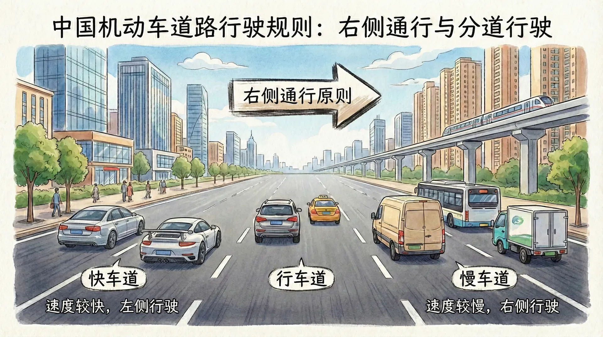 分道通行是道路交通管理的基本原则,它将不同速度、不同类型的交通工具分隔在不同的车道上,从而降低交通冲突的概率,提高道路通行效率。这一规则的核心在于各行其道,互不干扰。