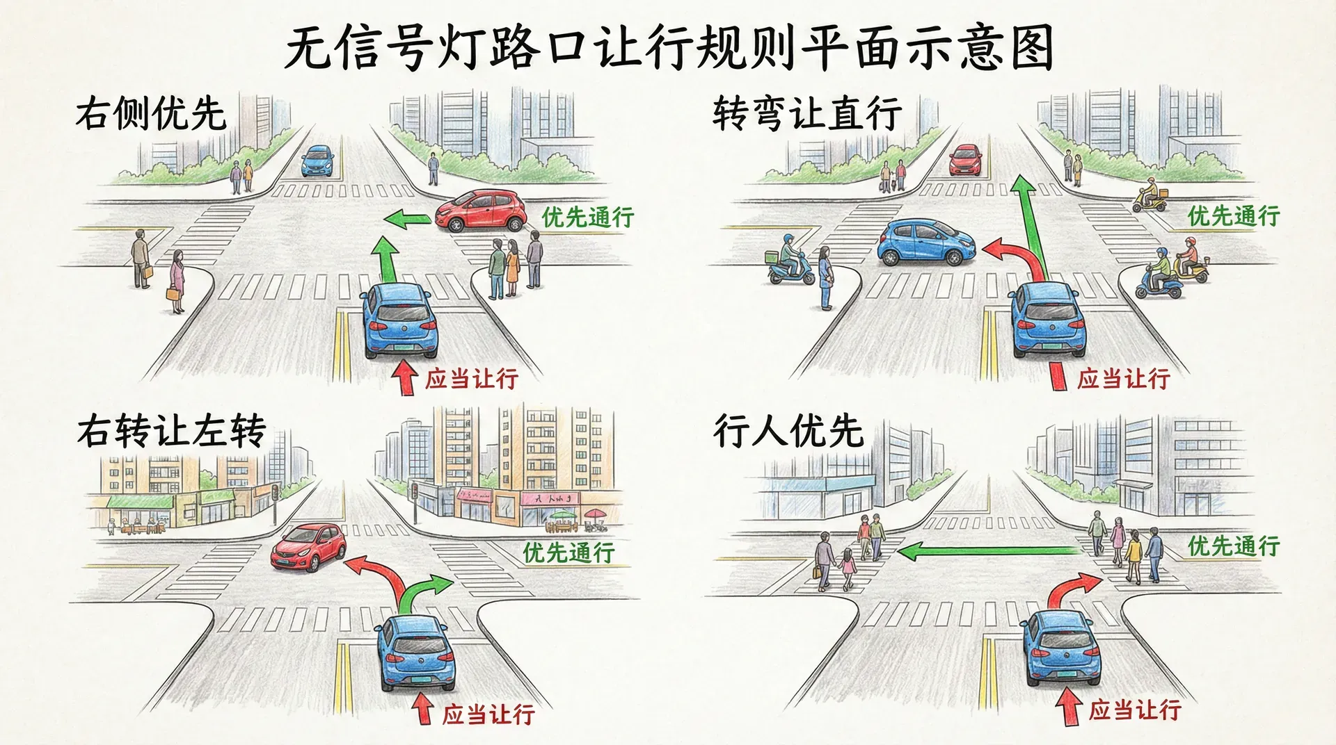 在没有交通信号灯控制的路口,让行规则显得更为重要。此时,驾驶员需要根据道路标志标线以及交通实际情况,判断自己是否享有优先通行权,还是需要让行。