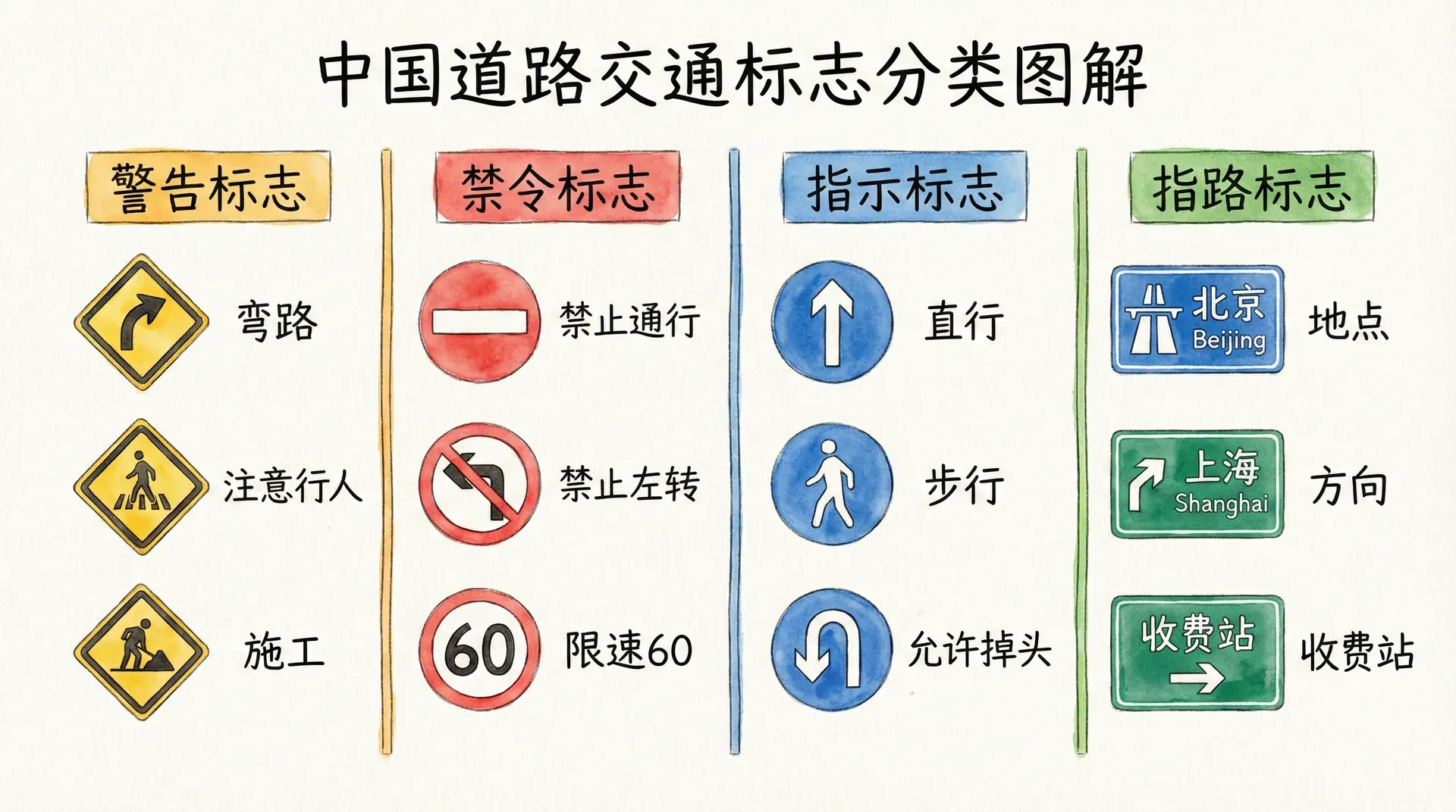 交通标志是道路交通管理的另一重要手段。与交通信号灯的动态指示不同,交通标志通过固定的图形、符号和文字,向交通参与者传递道路信息、警告危险、明确禁令、提供指示。
