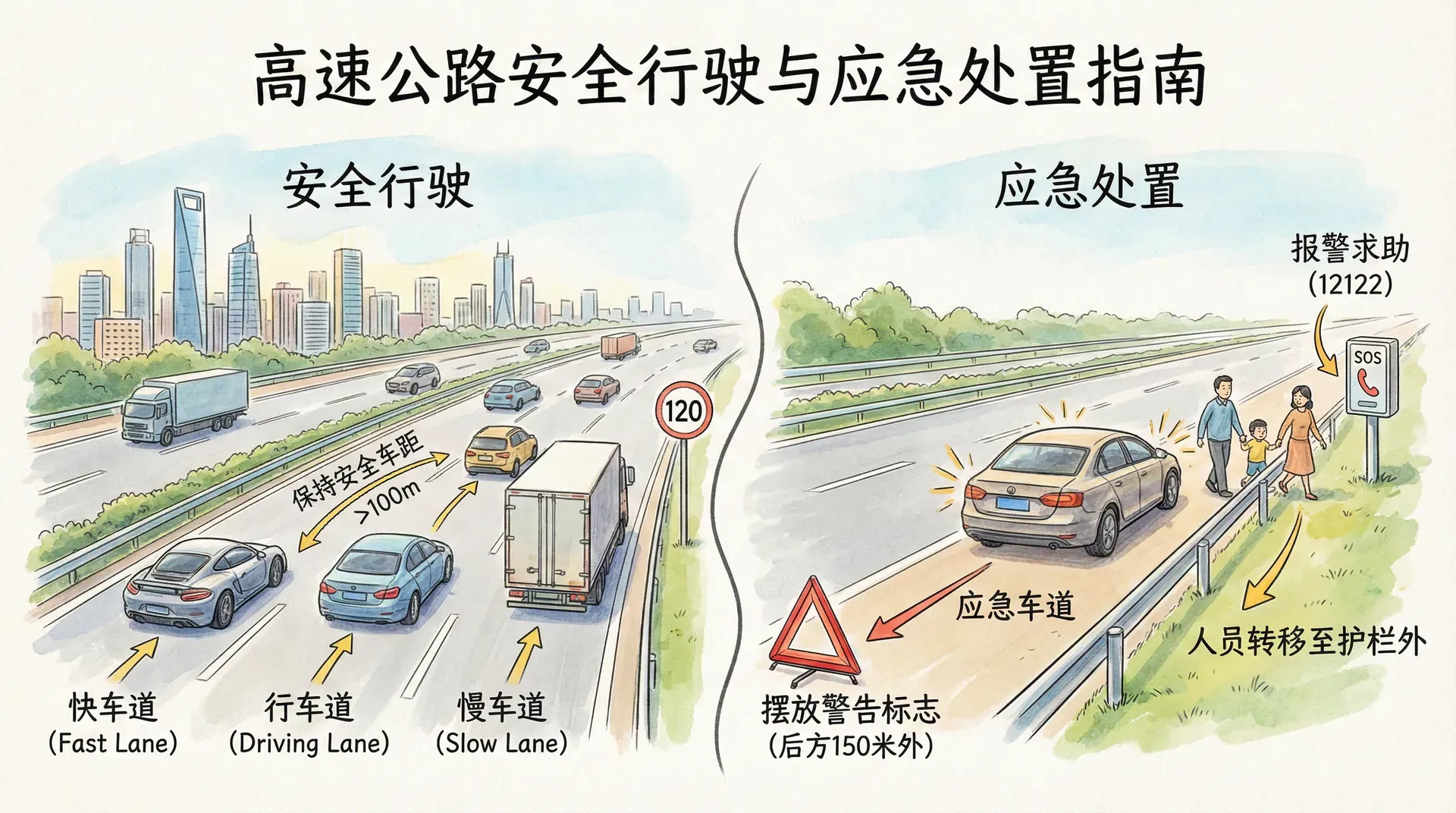 车上人员迅速转移到安全地带是至关重要的。每年都有在高速公路上因车辆故障而停留,结果被后方来车撞击造成人员伤亡的事故。在车辆发生故障后,驾驶员和乘客不应留在车内或在车辆周围逗留,而应迅速转移到护栏外的安全地带,等待救援。