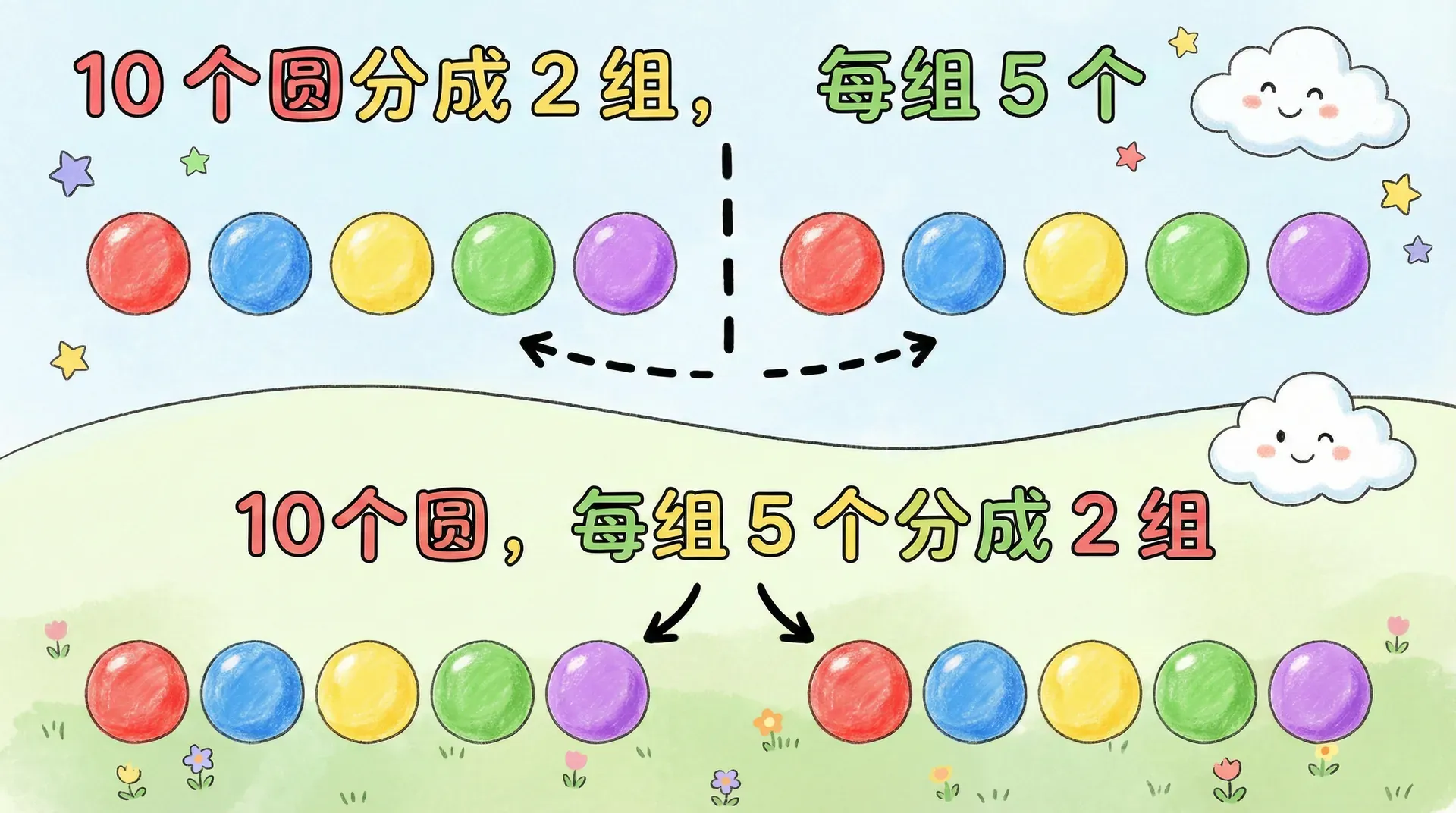 上节课我们学了乘法——把几个相同的数加起来。除法正好相反:把一个数平均分成几份,每份是多少?