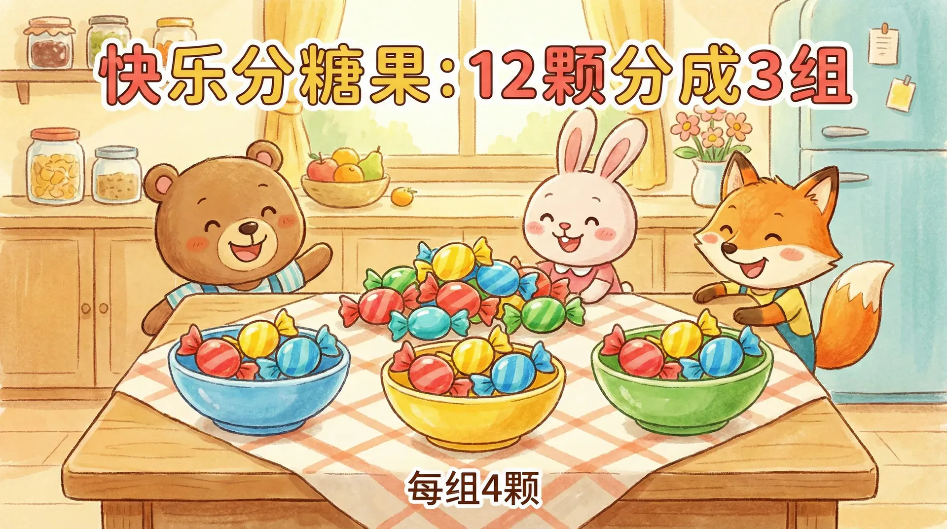 把 12 颗糖平均分给 3 个小朋友,每人得到同样多的糖。这就是平均分——每份都一样多。