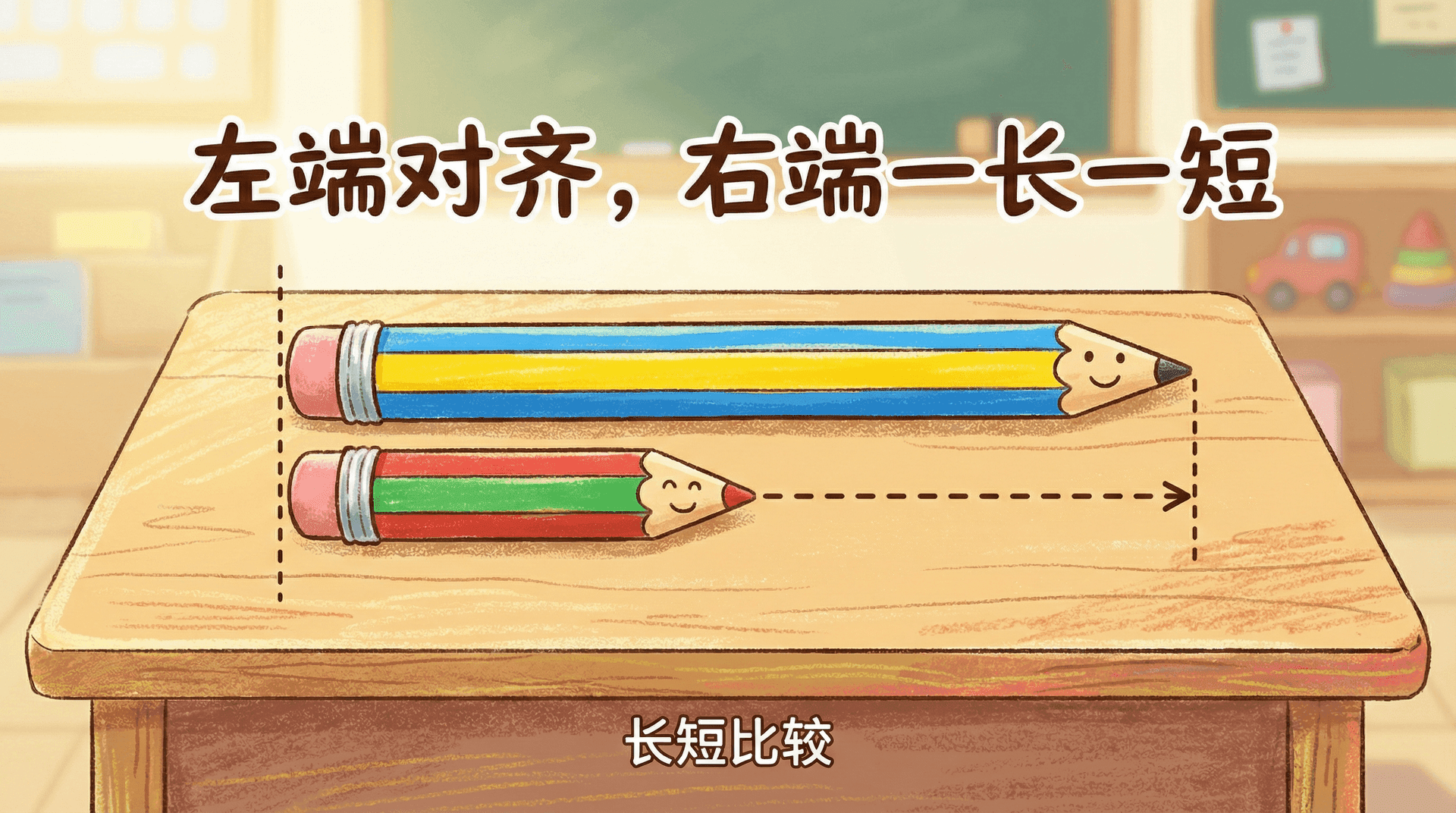 比较两个物体的长短,方法很简单:把它们放在一起,一端对齐,看另一端谁超出去更多——超出去的那个更长。