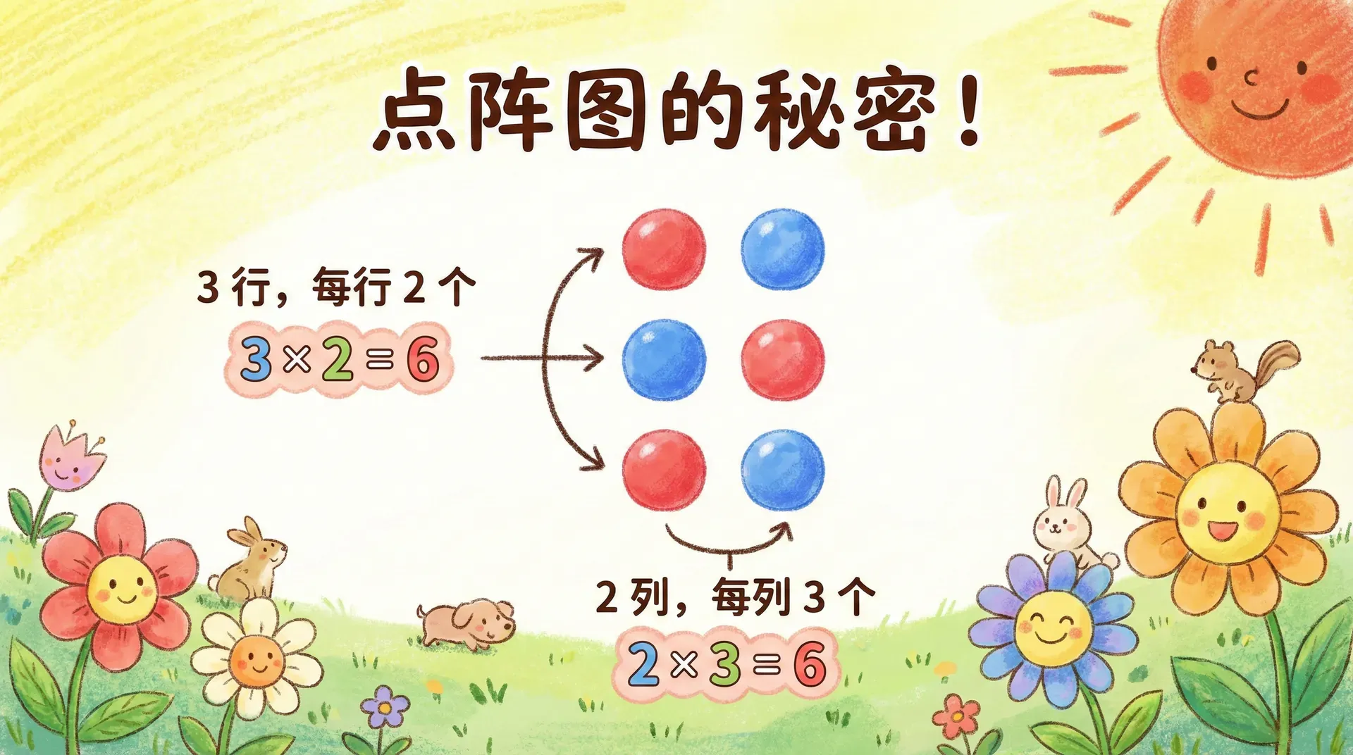 这节课你会学到: 理解乘法是「几个相同数相加」的简便写法,认识乘号「×」,能读写简单的乘法算式,并理解「几个几」的意思。