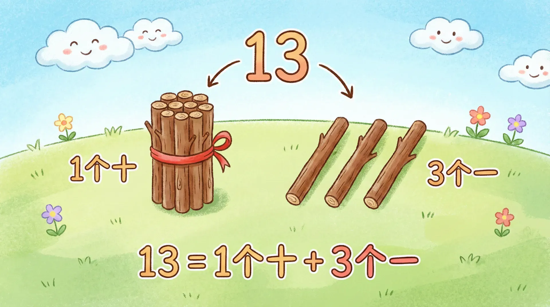 先把 10 根小棒捆成一捆,这一捆就是「1 个十」。再加 1 根,就是 11(十一);加 2 根,就是 12(十二)……