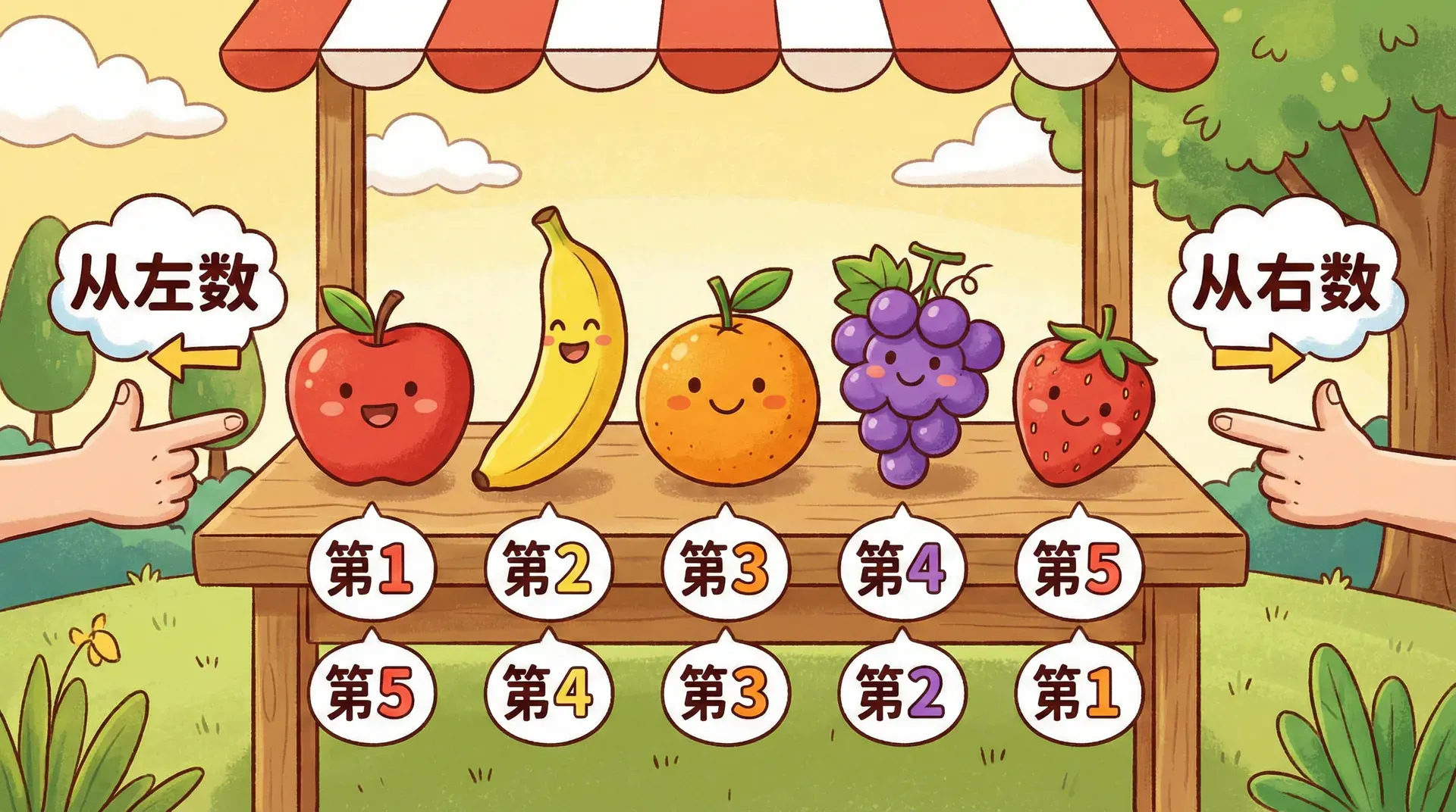 举例:一排有 5 个小朋友,从左边数,小红排在第 3 个;但「5 个小朋友」说的是一共有 5 个人。