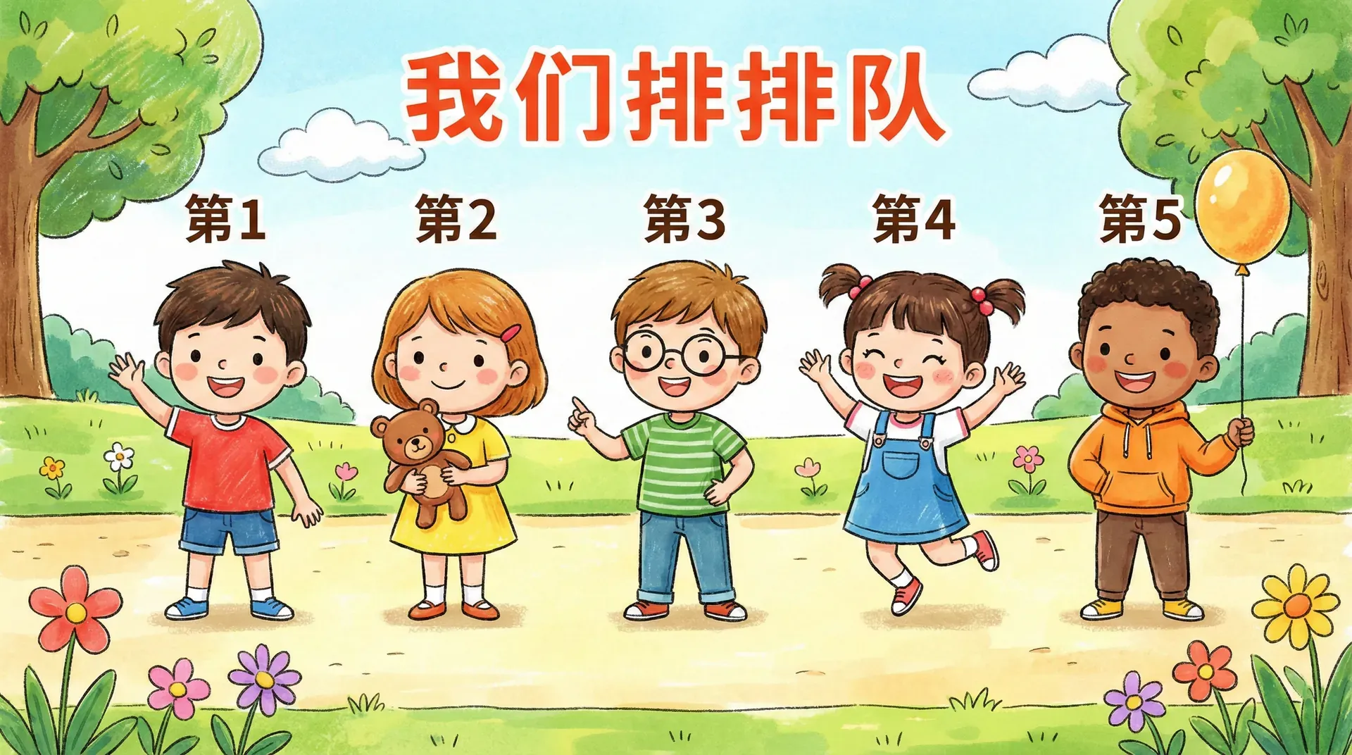 这节课你会学到: 区分「几个」和「第几个」,能说出一排物体中某个东西排在第几,以及第几个是什么。