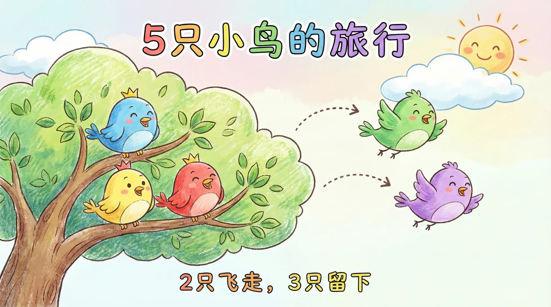 树上有 5 只小鸟,飞走了 2 只,树上还剩几只?