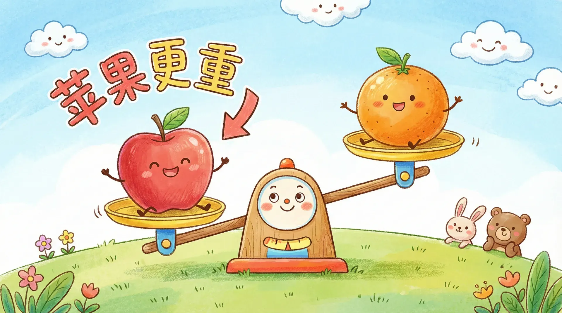 这节课你会学到: 用「重/轻」描述物体,掌握三种比较重量的方法(猜一猜、掂一掂、用天平),理解重量也是相对的。同时初步认识容量的概念(哪个装得多)。