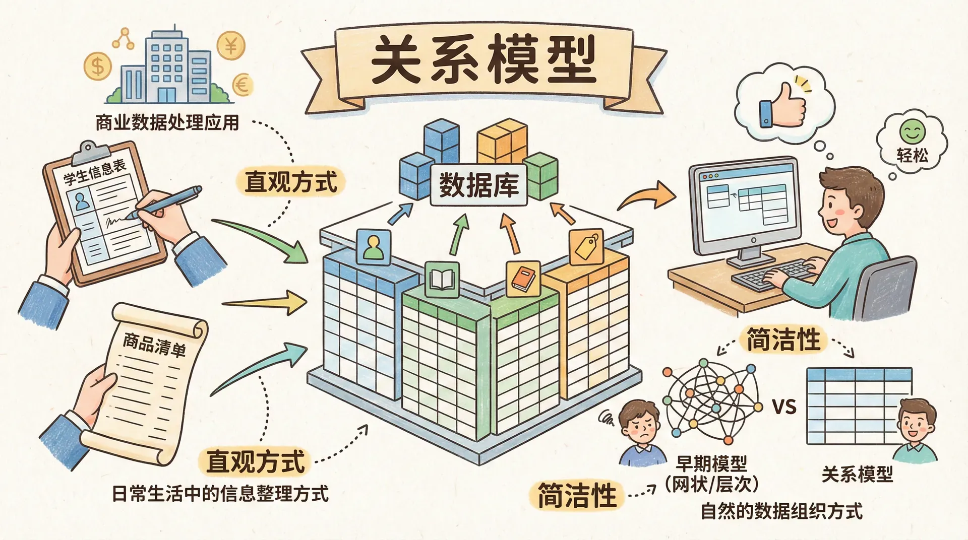 关系模型之所以成为当今商业数据处理应用的主要数据模型,是因为它的简洁性让程序员的工作变得更加轻松,相比于早期的网络模型或层次模型, 关系模型提供了一种更加自然的数据组织方式。