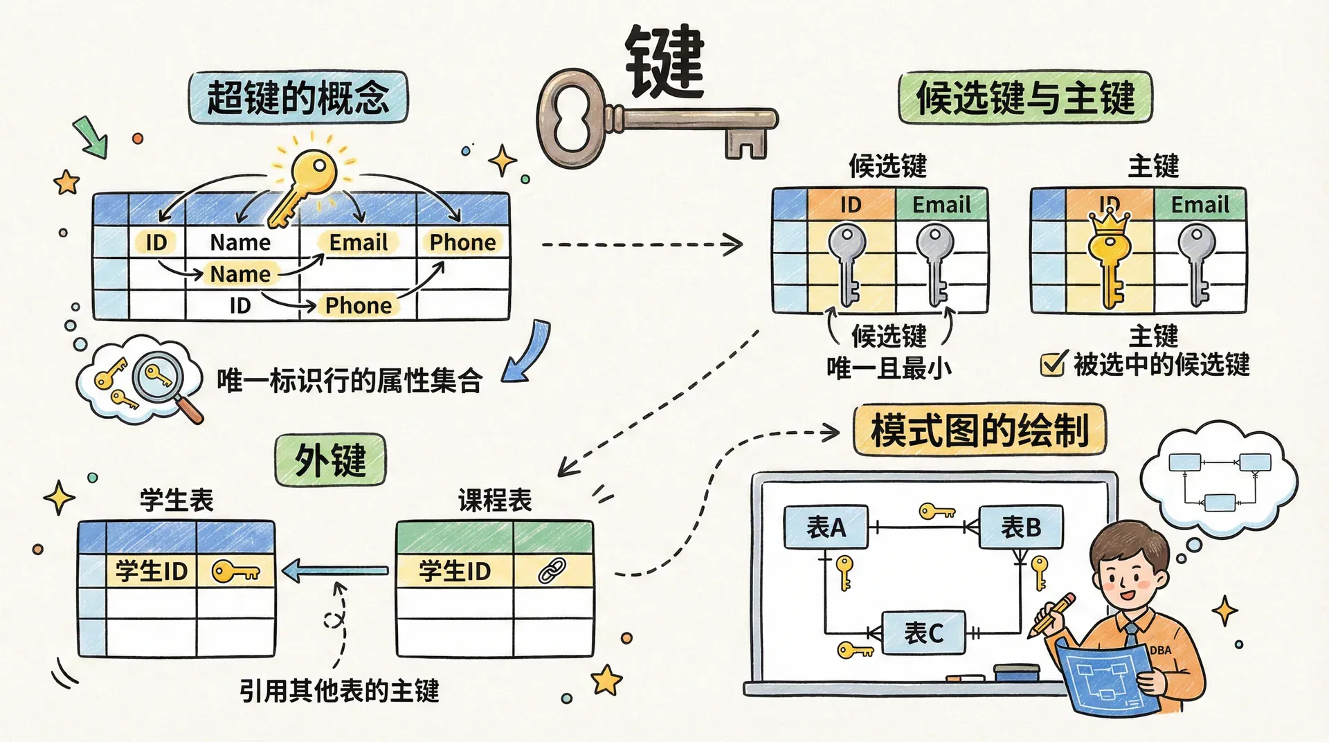在关系数据库理论中,“键”是用于唯一标识关系中元组(行)的属性或属性组。它不仅是数据检索和完整性约束的基础,也是关系模型结构化管理的核心工具。