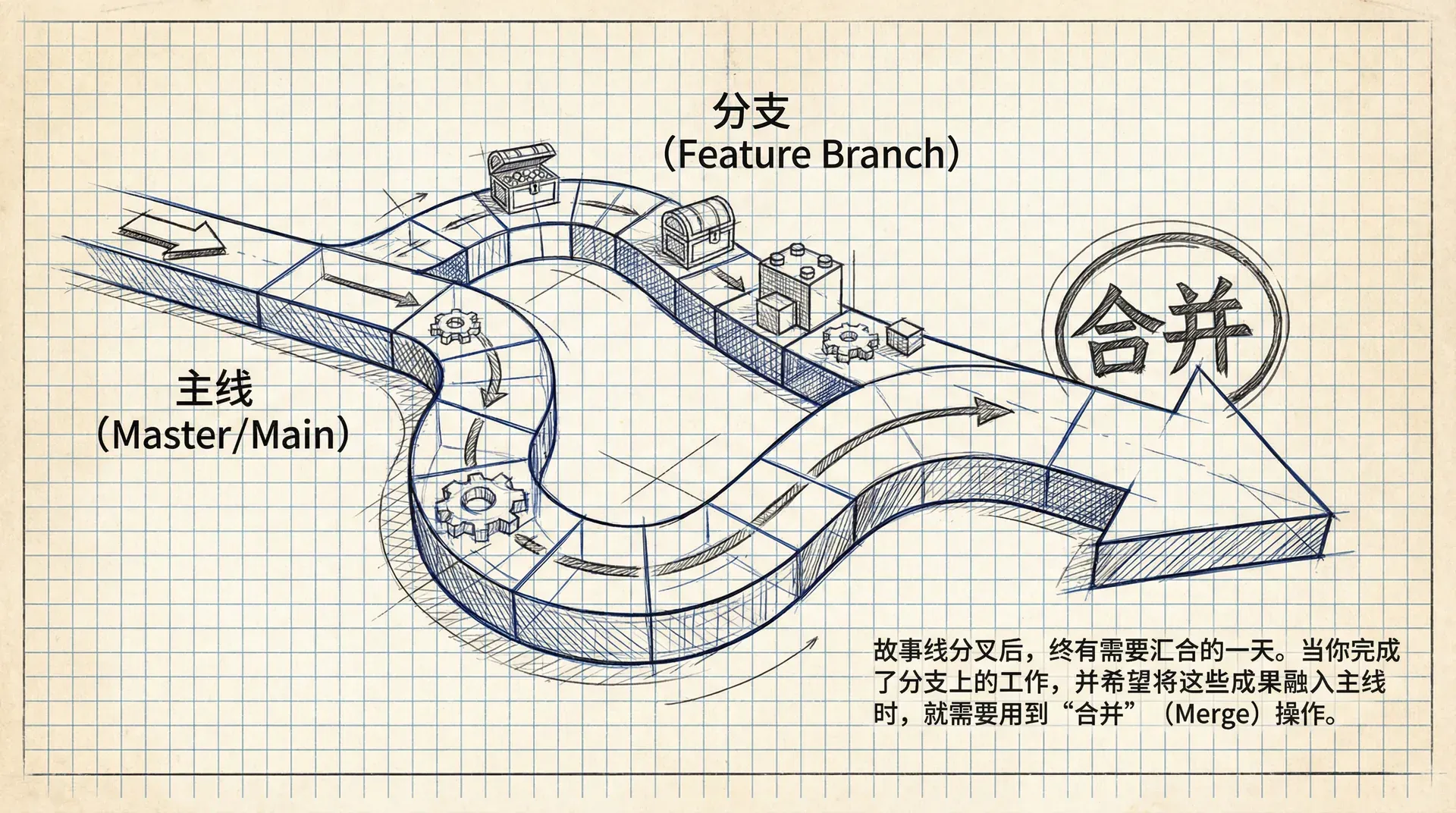 故事线分叉后,终有需要汇合的一天。当你完成了分支上的工作,并希望将这些成果融入主线时,就需要用到“合并”(Merge)操作。