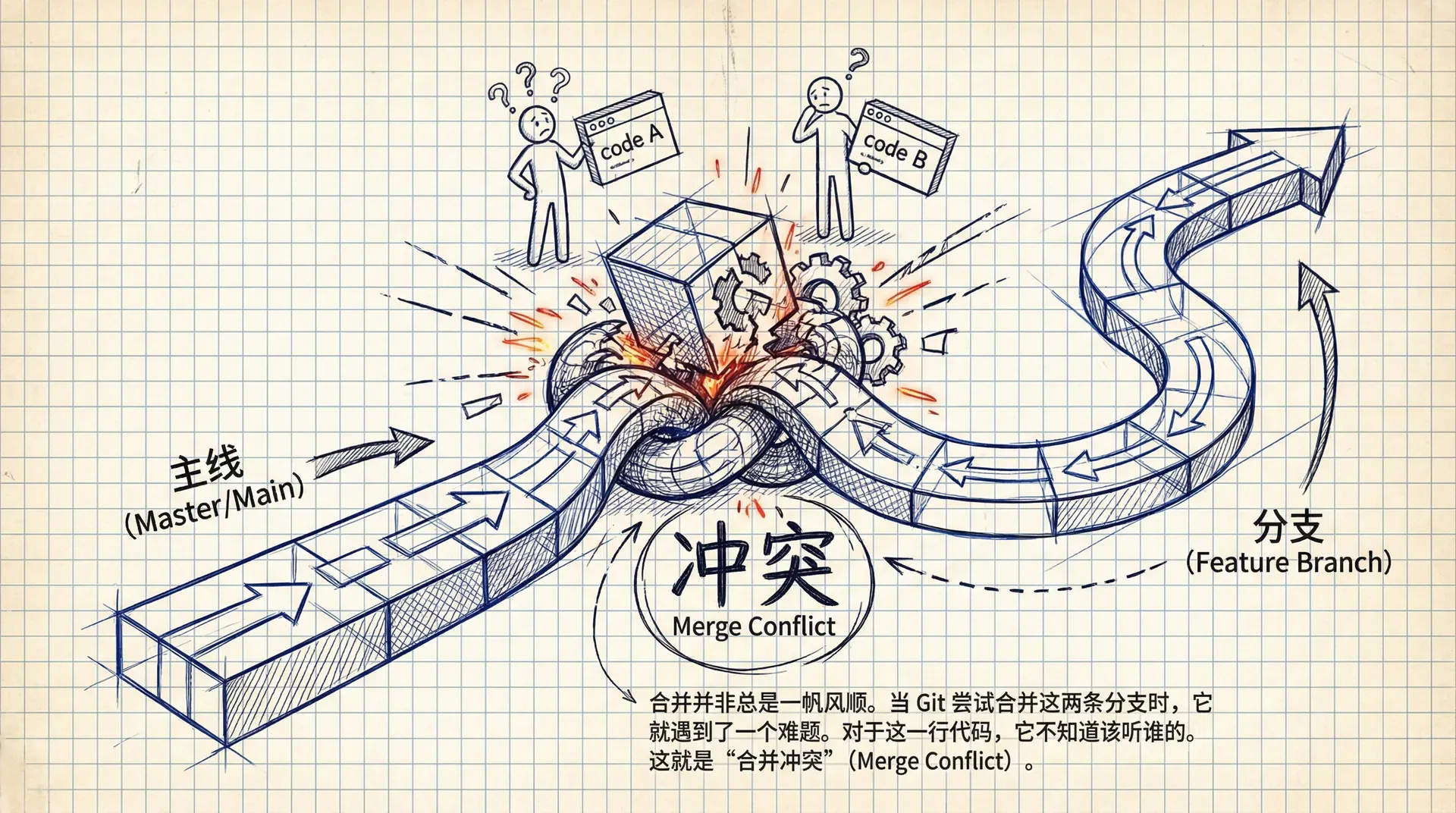 当 Git 尝试合并这两条分支时,它就遇到了一个难题。对于这一行代码,它不知道该听谁的。这就是“合并冲突”(Merge Conflict)。