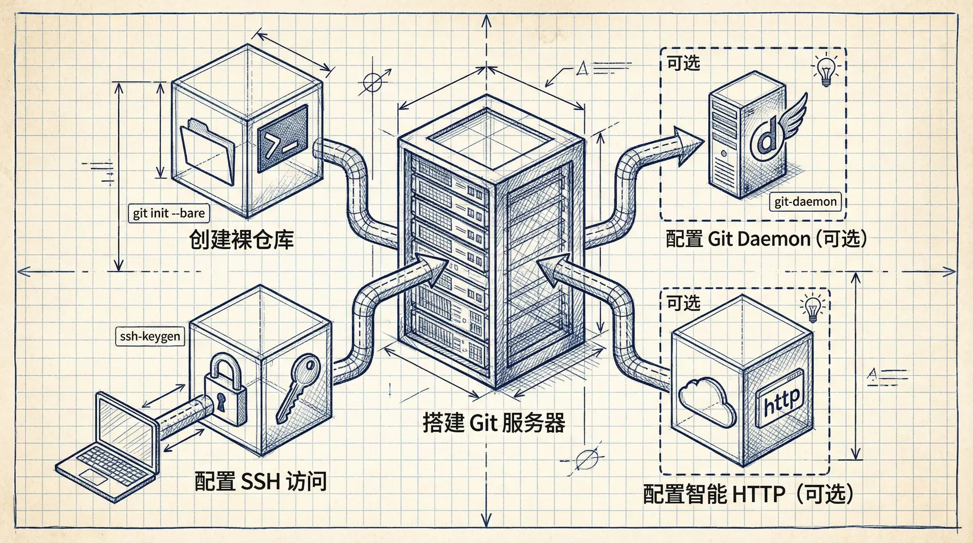 对于需要完全控制代码仓库的组织,可以选择自行搭建 Git 服务器。搭建过程主要包括创建裸仓库、配置访问协议和设置权限管理。
