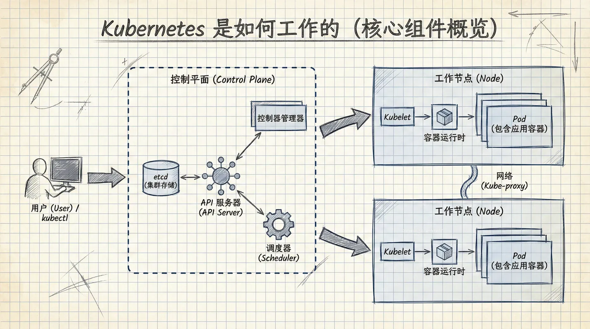 首先,把 Kubernetes 想象成一个计算机集群。它和别的集群一样,由一堆计算机(我们称之为节点)和一个控制平面(Control Plane)组成。 控制平面就像是集群的“大脑”,负责发号施令,比如决定哪个程序该在哪个节点上运行、如何自动扩缩容、如何实现零停机更新等等。 而节点们就是“肌肉”,负责执行“大脑”下达的命令,日复一日地运行着我们的应用程序代码。