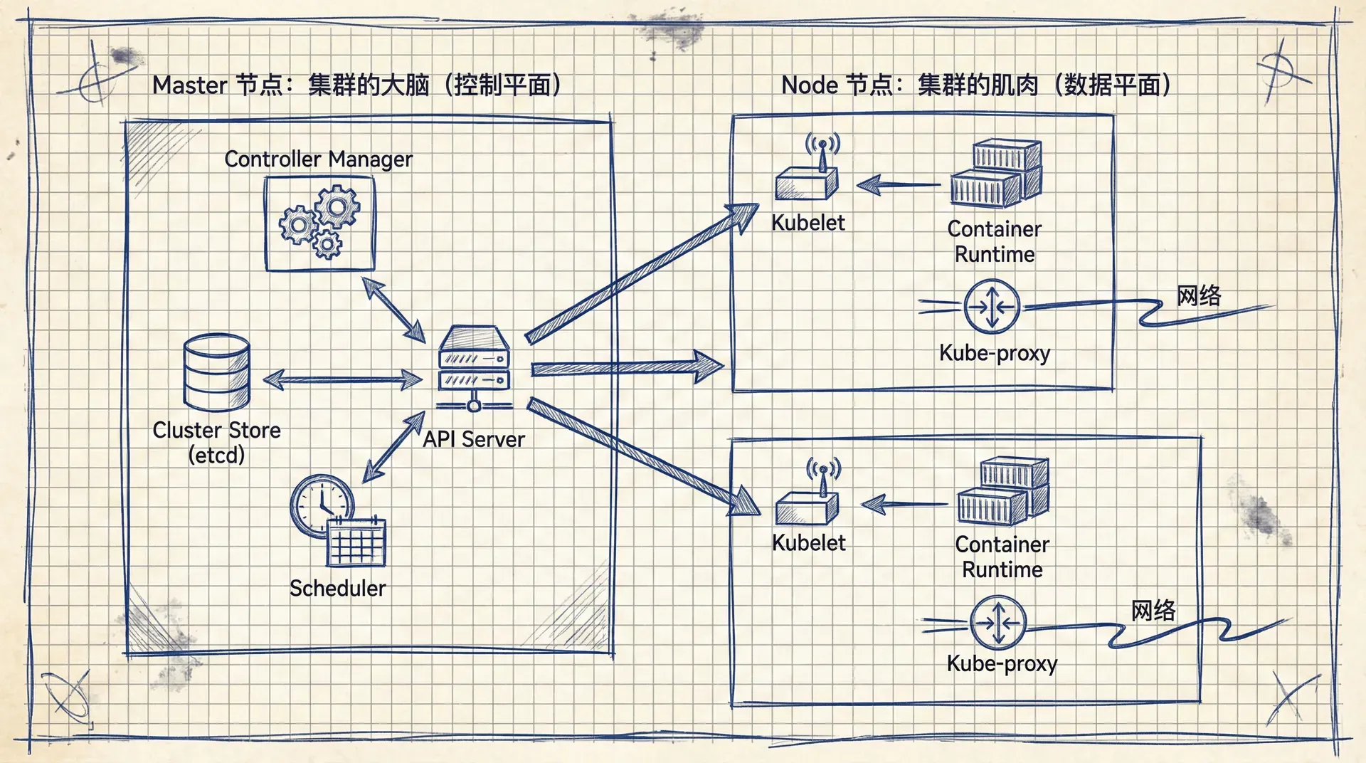 在本节中,我们深入探讨了 Kubernetes 的核心运作机制。Kubernetes 集群由控制平面(Master 节点)和数据平面(Node 节点)构成,其中控制平面负责全局的决策和调度,而数据平面则负责具体的任务执行。