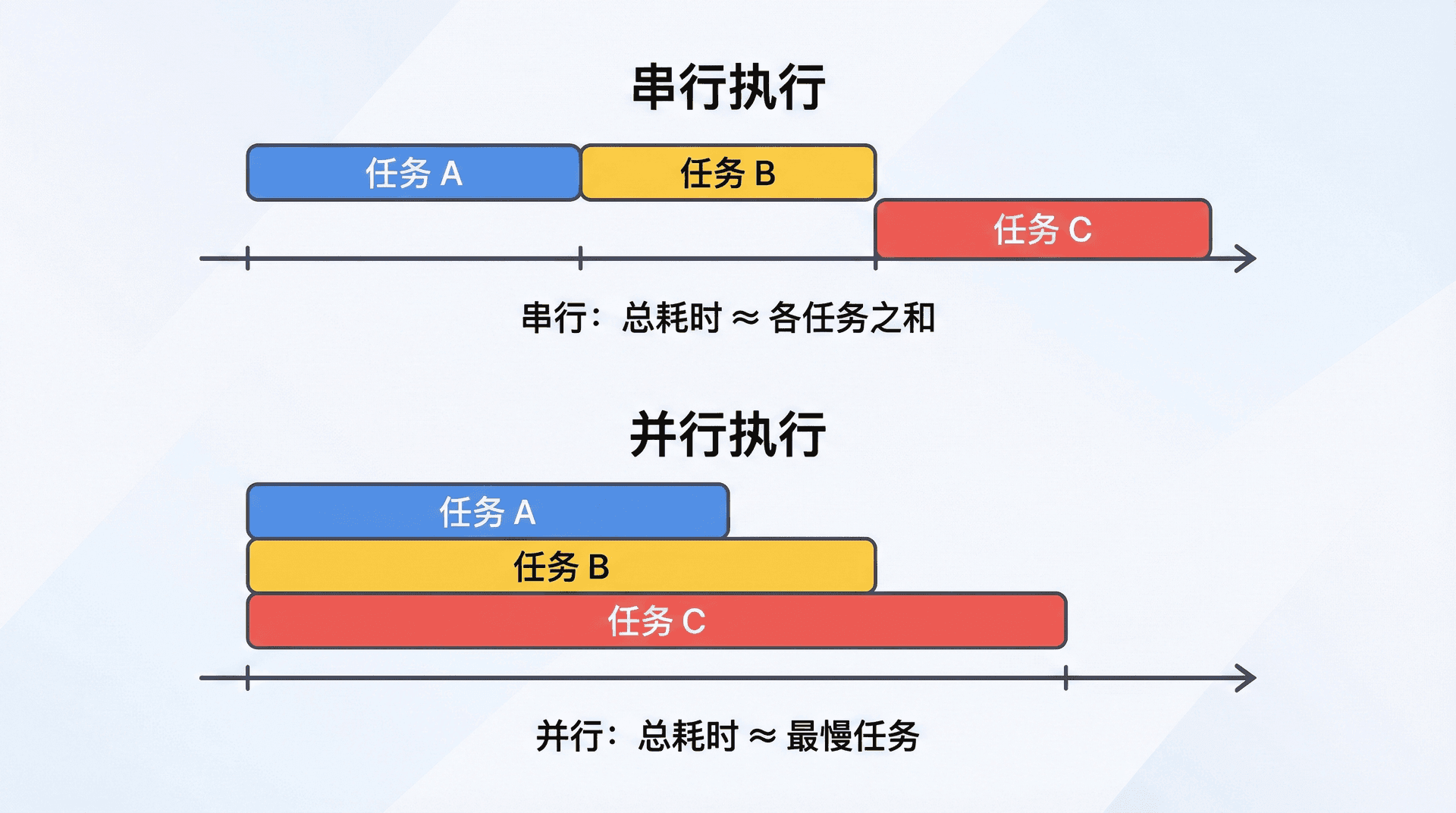 串行执行在时间线上的形态是「任务 A 完成 → 任务 B 开始 → 任务 B 完成 → 任务 C 开始」,总耗时约为各任务耗时之和。与并行对比时,若三个任务各需 1 秒,串行需要约 3 秒,并行则可以在约 1 秒内全部完成(假设资源允许同时进行)。下面用一张图概括串行与并行在时间线上的差异,便于后面讨论并行时对照。