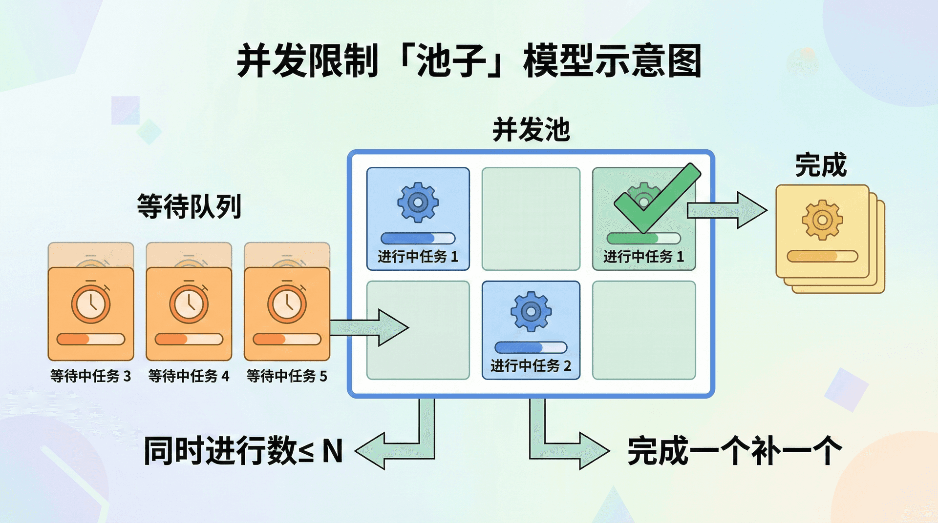 通过并发限制,我们保持「同时进行」的任务数在一个上限 N 以内:一开始启动 N 个,每当有任务完成就从等待队列里取一个补上,这样任意时刻最多只有 N 个任务在进行,总任务数可以很大,但系统负载可控。从时间线上看,无限并行是「所有任务同时开始、各自结束」;并发限制是「一批一批地执行,同一批内并行、批与批之间通过完成-补位衔接」,有时也被比喻为「池子」:池子里最多 N 个任务在跑,完成一个就从队列里放一个进来。