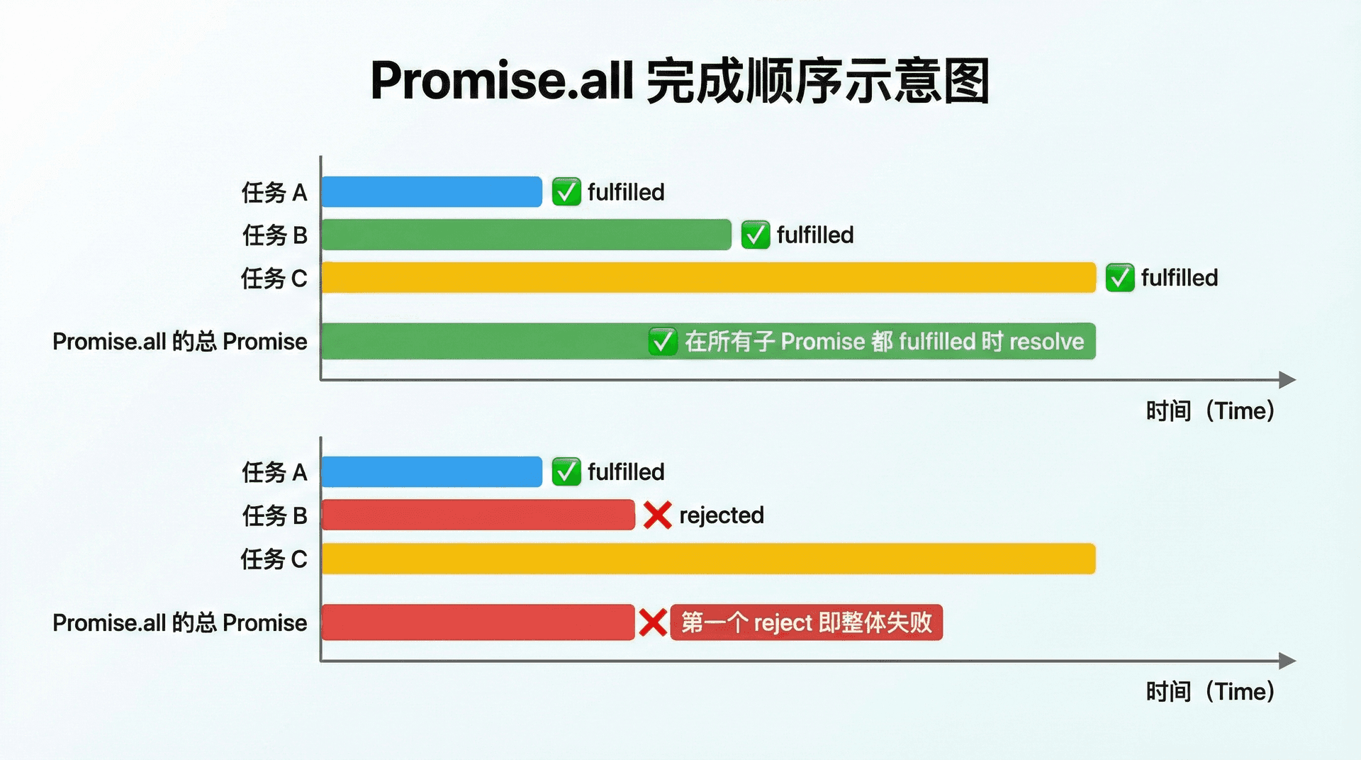 Promise.all(iterable) 接受一个可迭代对象(通常是数组),里面每个元素都是 Promise(或会被当作 Promise 的值)。它会等所有 Promise 都变为 fulfilled,然后返回一个数组,数组里每个元素是对应 Promise 的 fulfilled 值,顺序与传入的 iterable 一致。若其中任意一个 Promise 变为 rejected,Promise.all 返回的那个「总 Promise」会立刻变为 rejected,并且带上第一个被 reject 的原因;其余 Promise 的结果不再关心(它们可能还在进行中,但 all 已经失败)。因此,Promise.all 的语义是「全部成功才成功,一个失败就失败」。