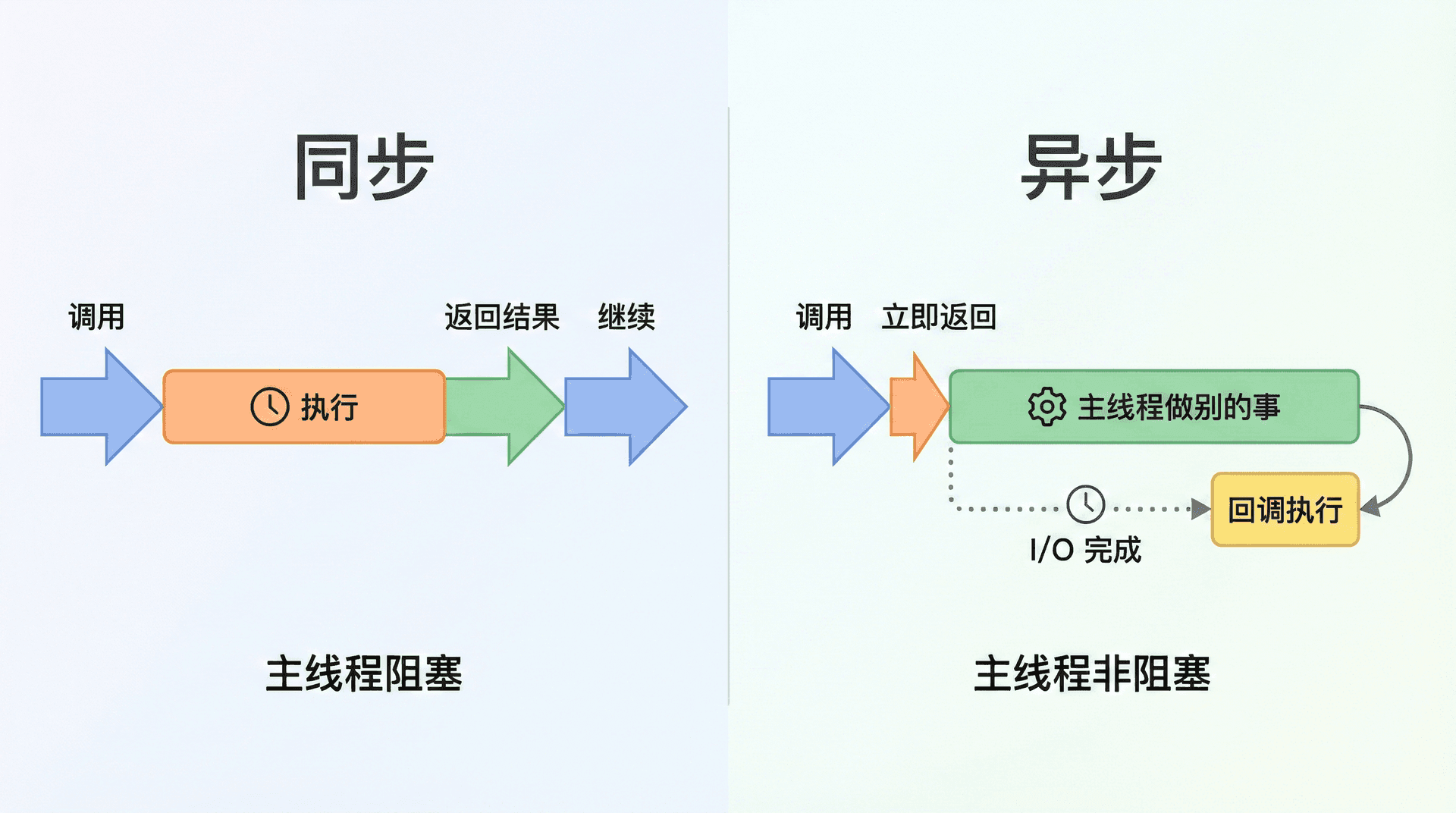 同步与异步描述的是「调用方何时拿到结果」,并没有直接说「等待时能不能干别的事」。「同步」不等于「阻塞」,「异步」也不等于「非阻塞」。例如 fs.readFileSync('data.txt') 是同步且阻塞的:要等读完后才返回,主线程在等的过程中不能执行别的 JavaScript。Node 绝大部分 I/O 提供异步版本(fs.readFile、http.request 等),也提供少量同步版本(如 fs.readFileSync);在请求处理路径上应避免使用同步 API。