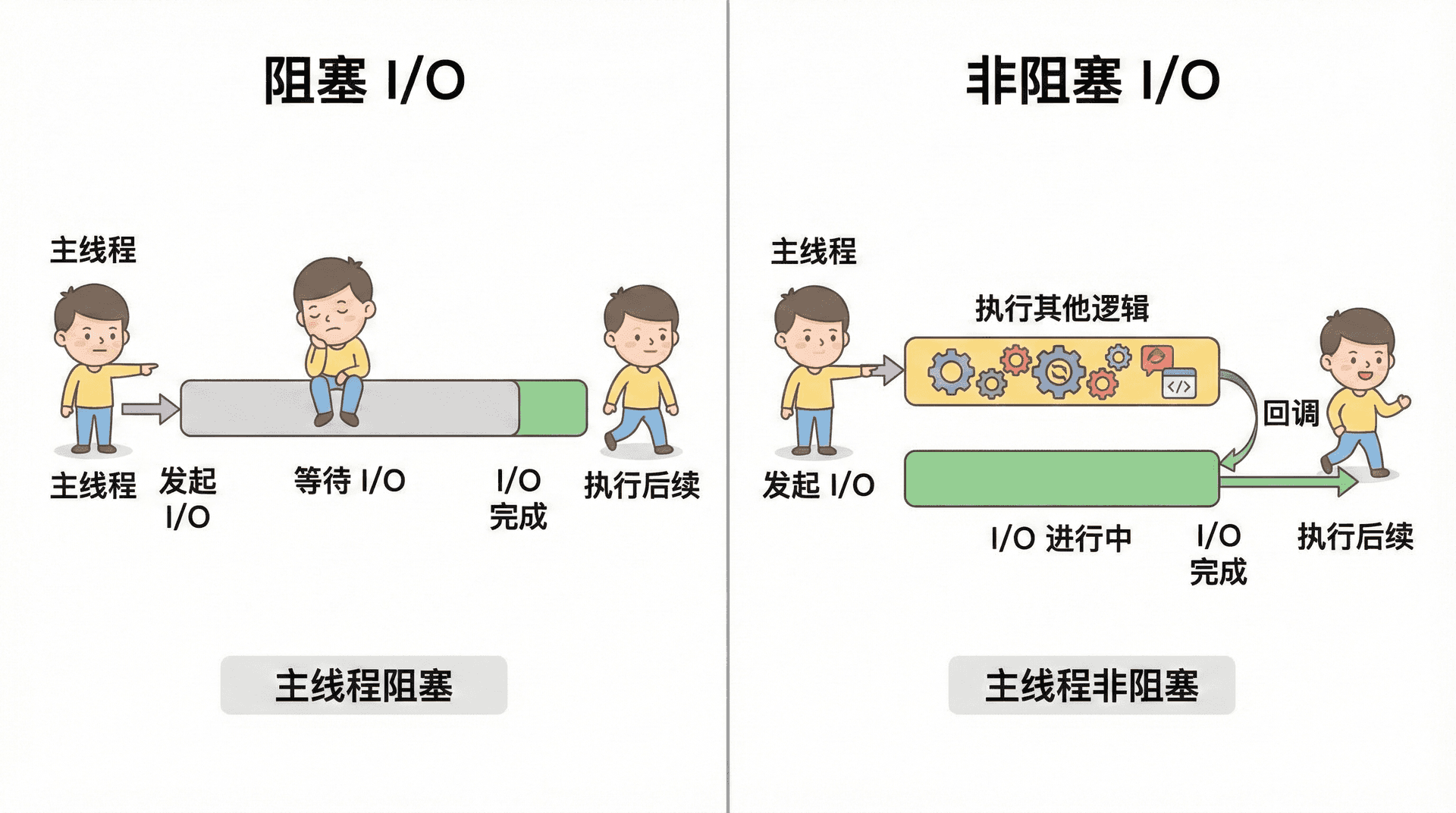 阻塞与非阻塞描述的是「等待结果时线程能不能干别的事」。Node 的异步 I/O API(如 fs.readFile + 回调)是非阻塞的;同步 API(如 fs.readFileSync)是阻塞的,应避免在请求处理路径上使用。