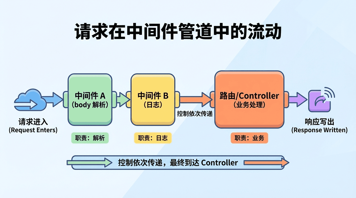 有了「路由怎么设计、Controller 该干什么、请求响应长什么样」的共识之后,在实际编码中我们还会反复遇到一类横切逻辑:每个请求都要解析 body、都要鉴权、都要记日志、出错都要转成统一格式。 若把这些都写在每个 Controller 里,代码会大量重复且难以维护。