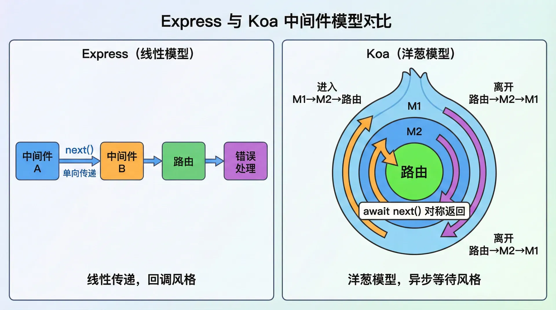 因此我们这部分专门讨论中间件模式与框架原理。我们会说明什么是中间件、它如何与路由和 Controller 配合;接着解释洋葱模型的含义以及「进入」与「离开」对称的执行顺序;最后分别梳理 Express 与 Koa 的执行流程,帮助你在使用或选型时知其然且知其所以然。