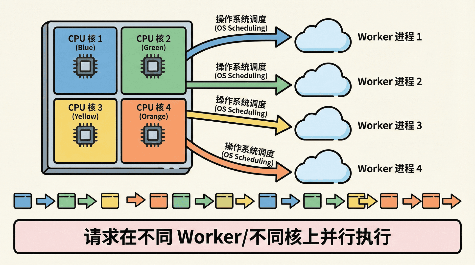 在上一讲我们讨论了安全与认证基础,让接口的「谁可以访问」有了清晰边界。在服务既稳又安全的前提下,接下来要面对的是吞吐与扩展能力:单机单进程能扛多少请求、瓶颈从哪里来、如何利用多核与多进程把纵向扩展做上去。