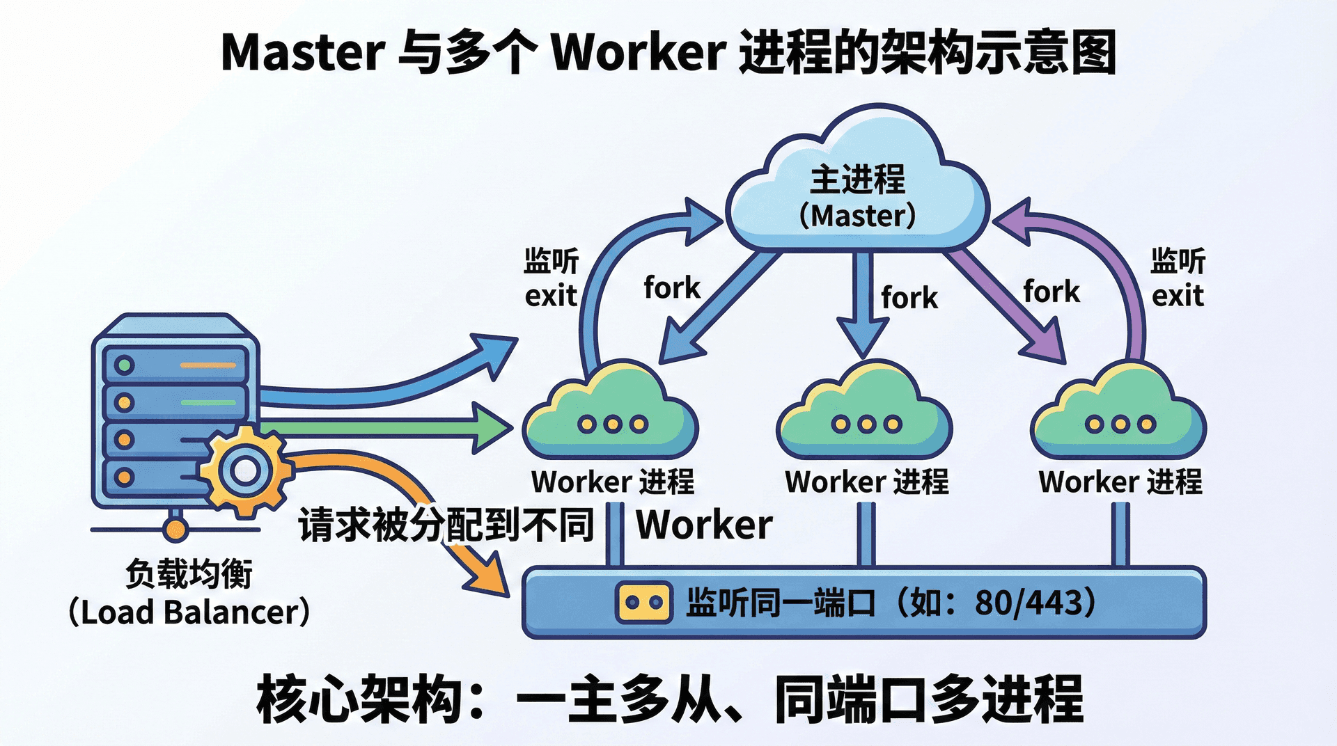 主进程与子进程的生命周期是分离的:主进程退出会导致所有子进程被带走,因此部署时通常让主进程作为顶层进程由 PM2 或 systemd 管理。端口由多个 worker 共享时,由内核或 Node 的 cluster 逻辑负责分发连接,不要在业务里再手动监听同一端口。同时不要把耗时业务或大量 I/O 放在主进程,主进程只负责 fork 与监控,否则会成为单点瓶颈。
