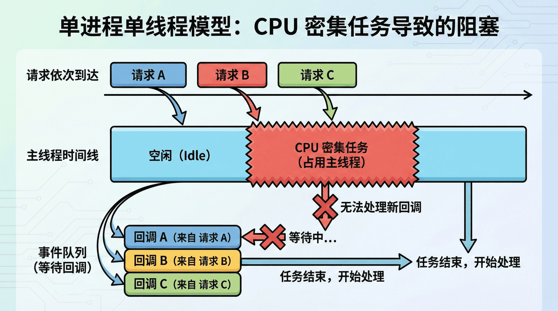Node 的一个进程里只有一条执行 JavaScript 的主线程,事件循环在这条线程上不断取出任务并执行。当某段逻辑需要大量 CPU 运算时,例如复杂的业务计算、大对象的 JSON 解析或序列化、或密集的加密解密,这段逻辑会在这条主线程上持续执行,期间事件循环无法去处理其它已经就绪的回调。于是新到达的请求、已经完成的 I/O 回调都会在队列里等待,从外部看就是延迟升高、吞吐下降,甚至请求超时。这就是「单线程」带来的天然约束:CPU 密集型的计算会占满这条唯一的线程,从而拖住整个事件循环。
