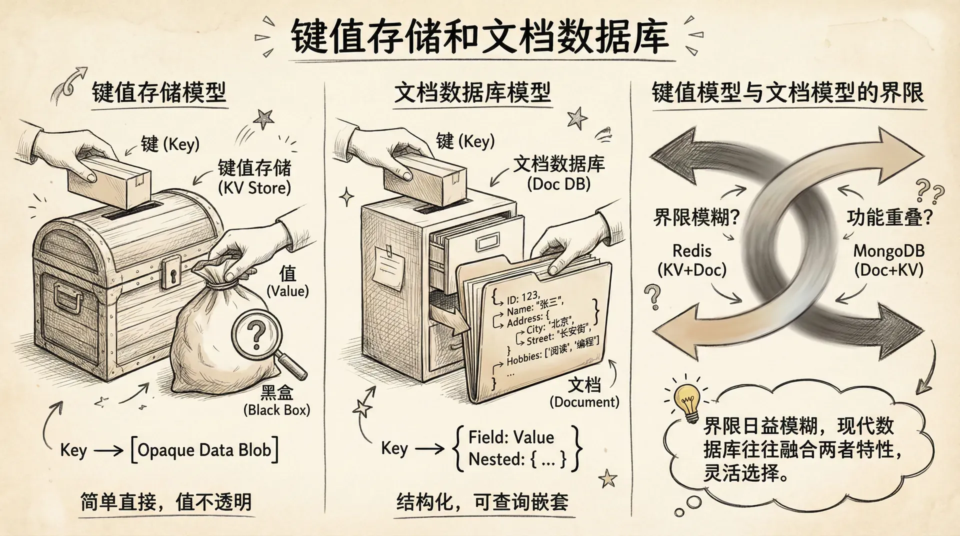 尽管通常将键值存储与文档数据库概念区分开来,现实的技术实现中二者并非泾渭分明、孤立存在。业界许多主流键值数据库同样原生支持多种数据结构(如列表、集合、哈希表等),允许对聚合内部元素进行原子级操作,无需整体读取和重写整个 value。 例如,Redis 虽为典型的键值数据库,却可以灵活地操作哈希表中的单一域、高效增删集合成员等,具备一定的结构化数据访问能力。